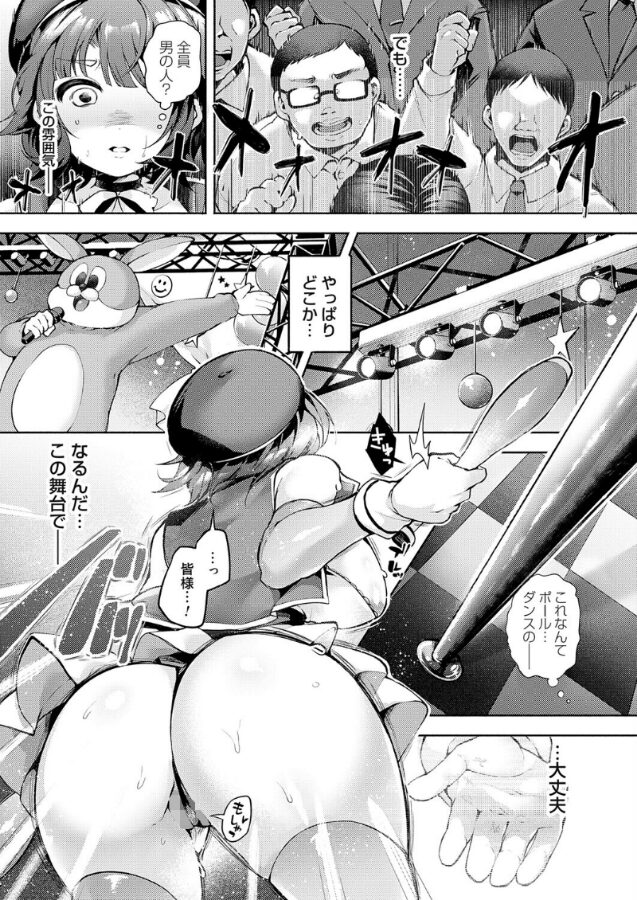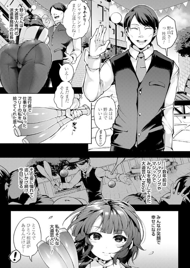 ’人生を変える一世一代のステージ。プライドと夢を賭けたショータイム。嘲笑われる卑猥な芸がスポットライトに照らされて──。大道芸人ライカは路上でパフォーマンスを行い日銭を稼ぐ。しかし流行病が落ち着いたとはいえ客足はまだ戻らない。そんな時、パフォーマーとしても尊敬する芸人派遣事務所の社長・野山(のやま)から誘いを受ける。金銭支援を兼ねた貸切イベントのメインを飾るも、衣装はピチピチ。爆乳はこぼれかけ乳輪が見えるほどで、レオタードの食い込みは陰毛がはみ出ている。そして観客は男ばかり…。しかしライカはプロとして、どんな状況でも目の前のお客を真面目に盛り上げる。「早くおっぱい見せろ!!!」だが、お客が見たいのは得意のジャグリングではない。突然の怒声に驚きライカは失敗。笑われ涙を浮かべるも、場を仕切り直すためにピエロが一輪車に乗って登場。座席にバイブを生やして乗らされ、ライカはチンポクラブでジャグリングを披露する。バイブが振動しイキ散らしても、笑顔で拍手を求める姿に客も大興奮。お次は司会に言われるがまま、ポールダンスを披露するが大事なクラブでクリトリスをピエロにコリコリ刺激される。オホ顔披露で潮を客席に向けて撒き散らした後、ショーはメイン種目のピエロとの生ハメへ…。超絶筆致でむちむちボディを描くよしみずの2nd単行本がついに発売決定!かわいそうは可愛いヒロイン7人が積み上げた夢が儚く舞い堕散る。’
