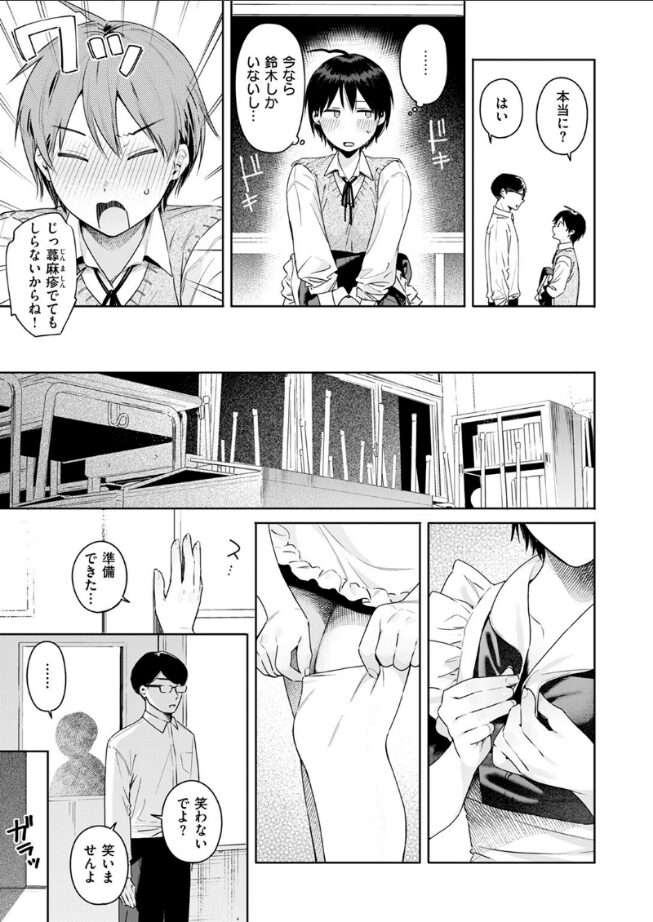 真央が普段の学生服姿から、皆の目を気にして着られなかったメイド服をまとうまでの流れが、本作の大きな見どころです。文化祭後の二人きりの教室で、進一に「個人的に見たかった」と促されてメイドコスプレをするシチュエーションは、秘密めいた背徳感があります。画像にもあるように、真央がメイド服を恥ずかしそうに着ている姿、スカートをめくって下着を見せている様子は、彼女の秘めたる欲望が解放されていく過程を表していて非常にエロいです。