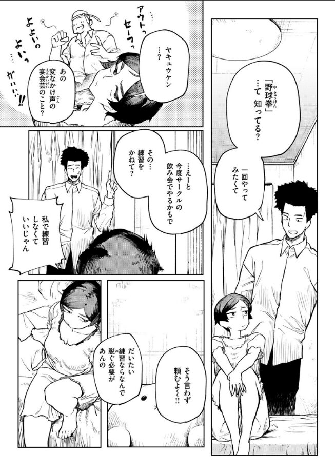 彼氏くんは、服を脱がすため野球拳を提案しますが、きな子ちゃんは彼の出す手がバレバレなことに気づき、逆に彼氏くんを身ぐるみ剥がしてしまうという逆転劇が発生します。しかし、ここで物語は一気に加速。きな子ちゃんは、「出す手がわかるならいつでも負けられる」ということに気づき、初めて見る彼氏の肌にドキドキが止まらなくなります。