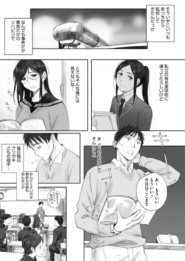 高橋は都内の有名進学校に通っていたらしいが、事件だか事故だかのリハビリで、田舎の公立校に転校してきたという噂だった。授業中に居眠りをしている高橋を注意する男性教師だが、内心ではわずかな諍いごとにも関わるのは嫌だとばかりに、教師生活に倦んでいる。放課後の教室には、男子生徒に囲まれ、命じられるままに性器を広げて男子たちに見せつけ高橋の姿があった。