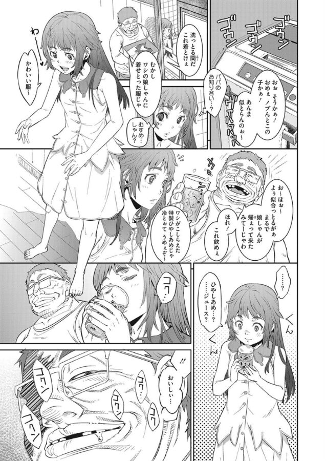 夏休み、父親の実家に来てもやることがない少女。畑のあぜ道を散歩していると、急にもよおしてきて、我慢できず、ナス畑の畝間でオシッコをしてしまった。誰もいないと思っていたが、後ろから畑の持ち主に話しかけられ、驚いて尻餅をついてしまう。叱られるかと思ったが、畑の主は優しく、汚れた服を洗ってくれるという。言われるまま主の家に行き、服を着替えさせてもらった。そして、特製のひやしあめという甘い飲み物を飲ませてもらったが、再び尿意をもよおしてきて…。