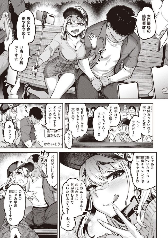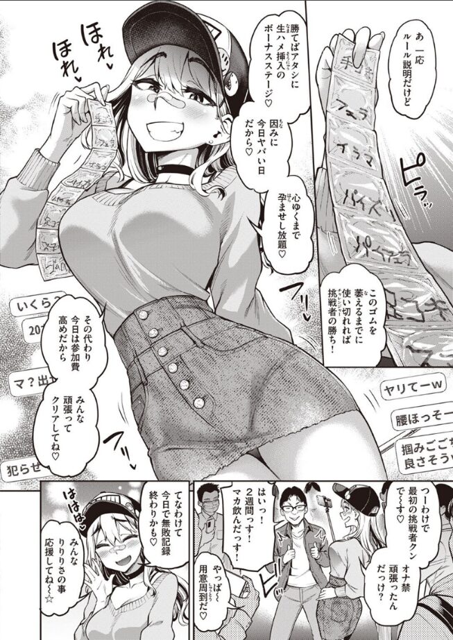 「勝てばアタシに生ハメ挿入のボーナスステージ♪」どんなことでも公開ナマ配信しちゃうドスケベビッチな配信者りりりさ。今日の企画は絶倫チャレンジ!! 手コキ、フェラ、パイズリ、スマタ……ゴムを使い切るまで射精を続けられれば挑戦者の勝ちというゲーム。まずは最初の挑戦者を秒イキさせたりりりさだったが、彼女の前に失恋したての童貞クンが現れて……?無敗のイキリビッチ完敗か!? 挿入を前に怖気づく姿を晒してしまい、視聴者からは『ビジネスビッチ』と疑惑の声も上がる!!想像を絶する絶倫巨根を前に――敗北受精を許してしまうのか……?