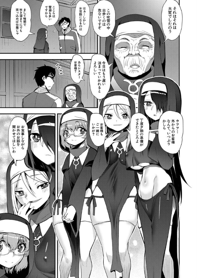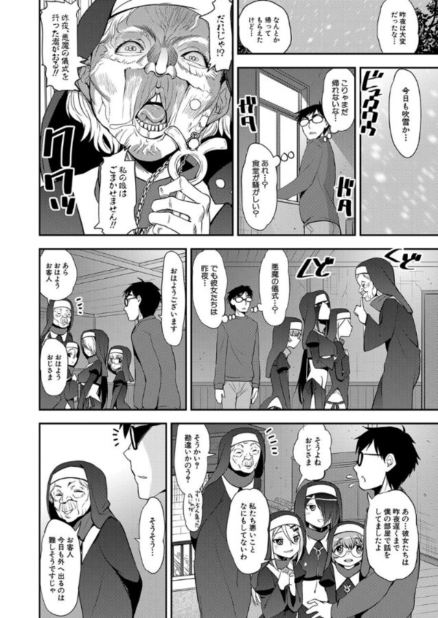 ドライブ中に吹雪に見舞われた主人公は、山奥にある教会の世話になることになった。教会に務める三人のシスターは外からの来訪者である主人公に懐いていた。しかし彼女達は夜な夜なエロ本を読み耽り、オナニーをしていた。姦淫に耽る行為を悪魔の儀式とし、悪い事と自覚はするものの、三人のシスターは男である主人公のチ〇ポやセックスに興味津々で……!
