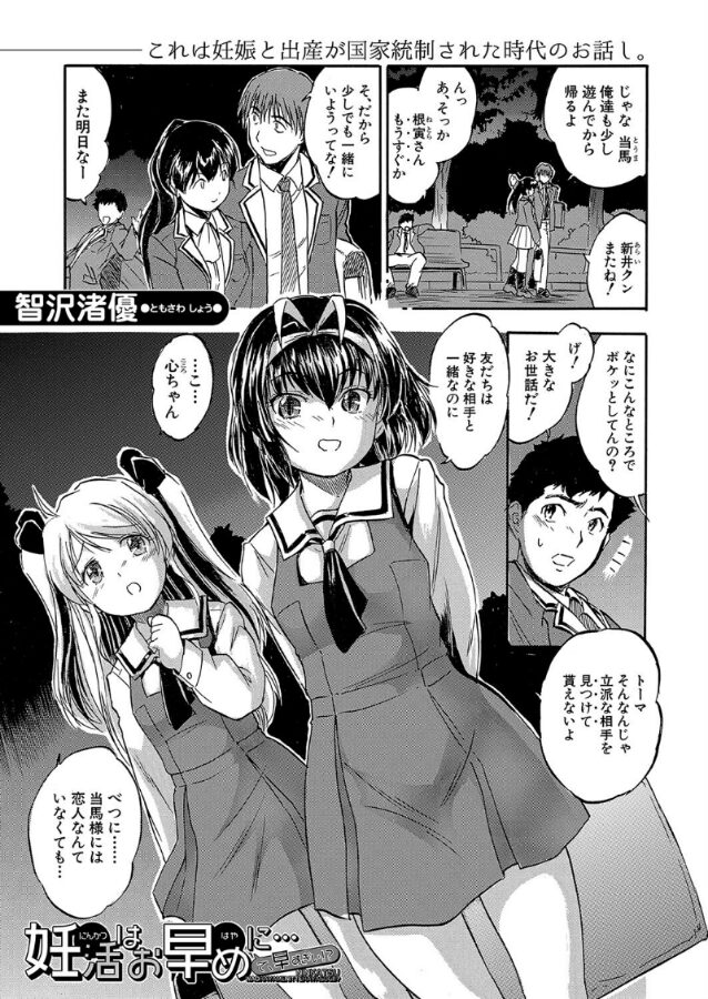 国の政策で結婚と出産が義務化され、統制された時代。主人公・当馬にも学生ながら種付けを行う妊活通知が言い渡されたが、妊活の相手は仲の良い少女・心ちゃんと早紗ちゃんだった!幼気なロリ娘二人を同時に相手して種付けセックスに励む。