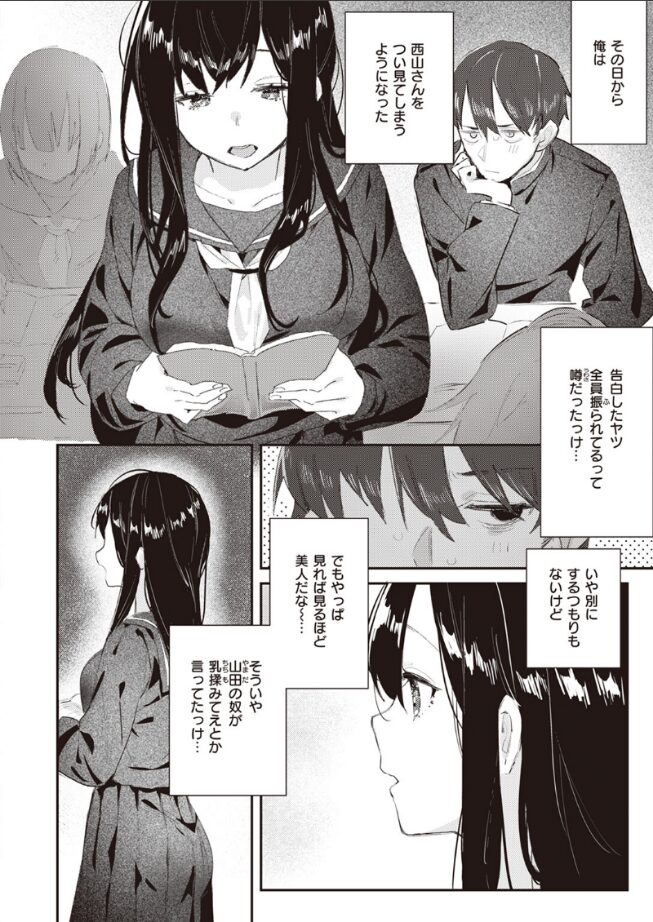 「西山(にしやま)さん…こんな所で無理矢理…」放課後、誰もいない学校。誰かが揉めているような物音に誘われ、女子更衣室を覗いてみると、そこにいたのは新体操部のエース・西山さんと、屈強な新体操部顧問だった。抵抗もむなしく、彼女の未使用のアソコが拡げられ、いじくられ……。止めなきゃいけないのに体は動かない。それどころか、乱暴される西山さんを覗きながら、自分のチ●コに手が伸びていき……。