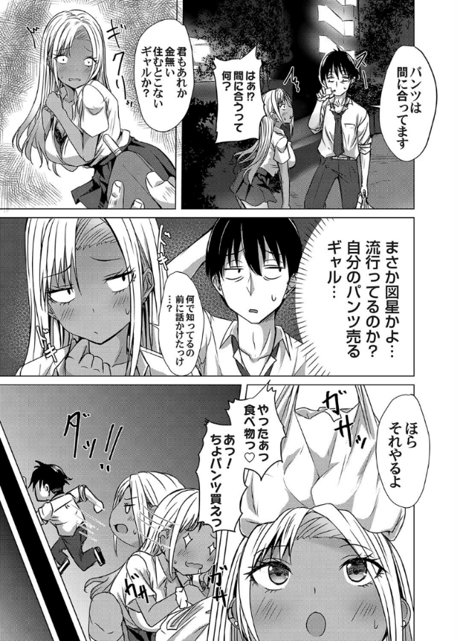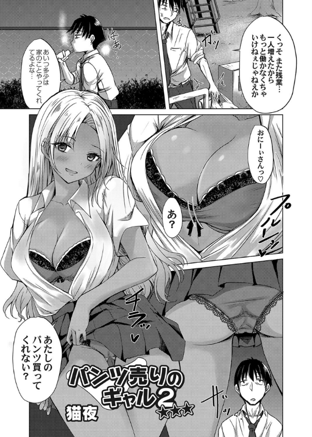 「おにぃーさんっ。あたしのパンツ買ってくれない?」サラリーマンの男は終電の残業帰りに突然スカートの超短い可愛い金髪ロングの黒ギャルから声をかけられた。「デジャブ…」すでに男はタイプは違えど以前に似た様なギャルに遭遇し、しかもそのギャルを家に住まわせていた。「ね?いいでしょ?今なら脱ぎたてっ。変態そうなおにーさんに特別」黒ギャルはお金に困っているのかグイグイと男にパンツを売ろうとしてくる。「まさか流行っているのか?自分のパンツ売るギャル……」男は以前とのギャルを思い出しながら、手にもっていた食べ物を黒ギャルに差し出すと、喜ぶギャルを残しその場を逃げ出した。男が家に帰ると「鬼待ってたんだけど──!」と以前に保護したギャルが出迎えた。がしかし、いつの間にやら先程出逢った黒ギャルも一緒についてきていた。「帰れ!パンツ押し売り女!」「うっさい!生活かかってんのよ!」いがみ合う二人のギャルは、家主である男を後目に白熱してゆく。次第にギャルバトルは変態男をどっちがエッチにさせられるか?というバトルに発展し、ギャル二人が男にイチャつく奇妙な展開に。しかし黒ギャルに意外な事実が判明して……。元気なギャル達の弾ける様なおっぱいとお尻とアソコまみれになっていく男は、もう我慢の限界を越えてしまい……。最新単行本『AVシェアハウス 〜セクシー女優たちとアダルトな共同性活〜』が大好評発売中な猫夜が贈る新作読み切りパート2!!