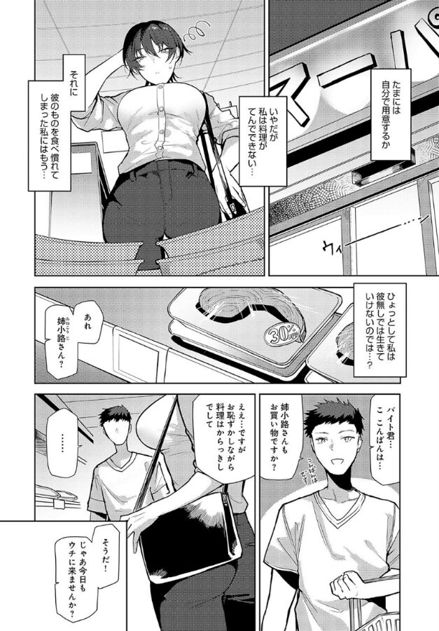 クールビューティーOL・姉小路さんは、バイト君に頼りすぎてる毎日に危機感を覚え自炊をすることに。しかしスーパーでバイト君と遭遇し、一緒に料理を作る流れに…!! 二人でお腹を満たした後はもちろん食後の運動だよね♪ 頼ってくれなくなることに不安を感じていつもより甘えたがりなバイト君を、ヨシヨシ騎乗位SEXで存分に甘やかして♪中性お姉さん最推し・おきょう先生が描く、『二人呑み咄』アフター! イケメンOLに甘えたり甘やかしたりな日常☆