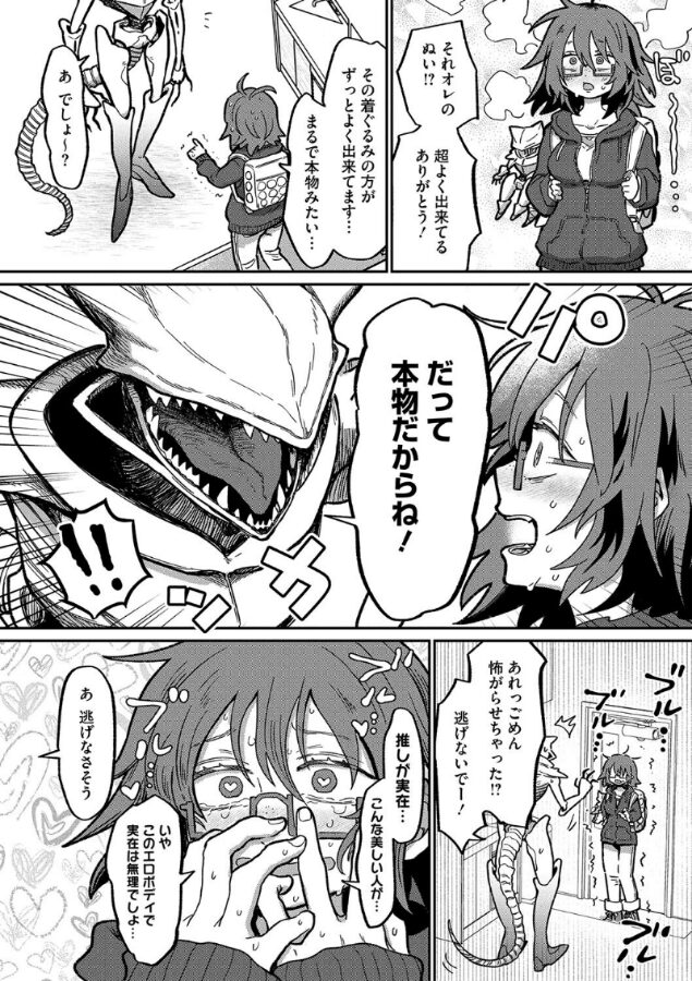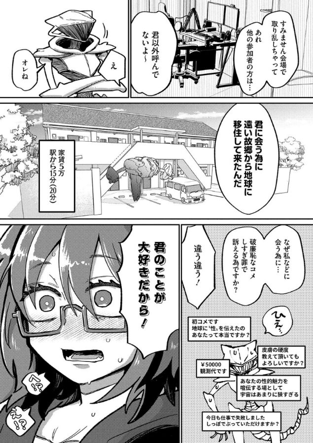 ☆宇宙人(♂)×人間(♀)オフ会に現れたVtuberは、モデルまんまの宇宙人であった──。未知のスリムなボディーがたまらんシコい!三白眼&芋眼鏡な地球人が銀河一エロい!両者の想いは銀河を越え、今ここに奇跡のファンミが実現!宇宙規模のペニスに抱きついたり、知らないことばに責められ、耳まで快楽にどっぷり漬かりながら……銀河一の初見プレイえっち、ヤっちゃいます♪