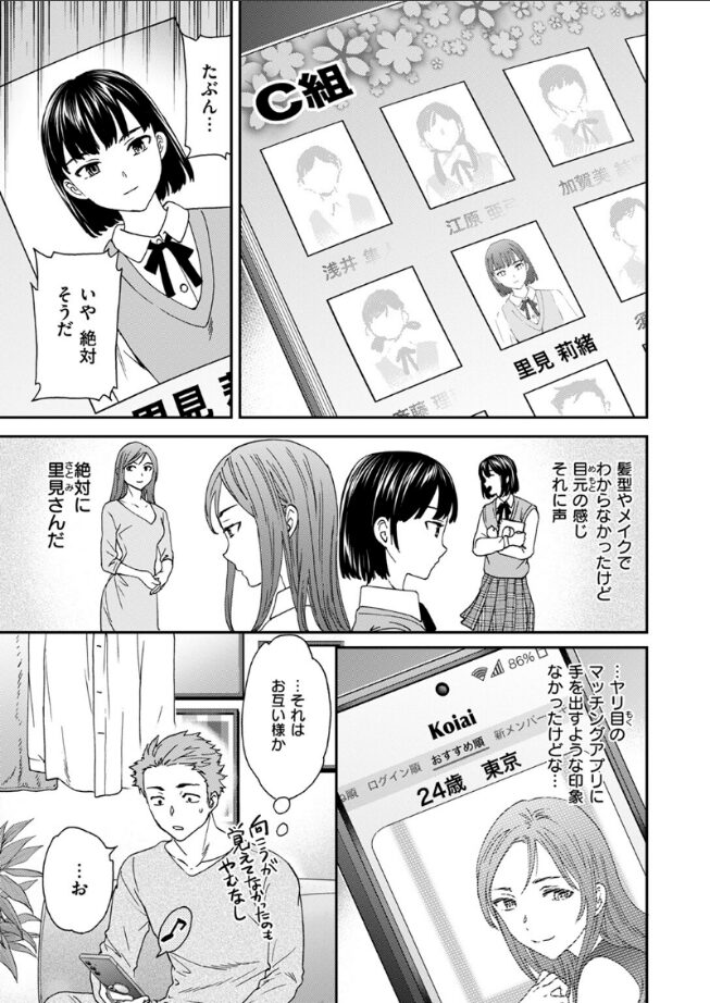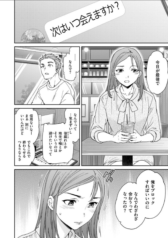 「こないだよりいじわるだよね なんで?」ヤリ目のマッチングアプリで出会った女性とSEXをしている依田(よだ)は、目元や声から、その女性が同級生の里見(さとみ)だと確信。後日、地元で噂が立つことを避けたい里見に「今日が最後で」と言われてしまう。SEX中、里見が自分を忘れていたことにやるせなさを感じながらも、身体の相性はばっちりで……。