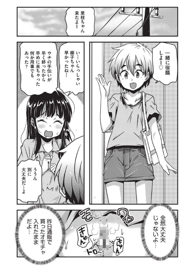 アナルオナニーにハマっている少女。通販で購入したオモチャを使って今日もアナニー三昧。翌日に友達が遊びに来るも、直前までアナニーをしていた少女は慌ててオモチャを取り出すのを忘れてしまいそのままで友達を迎えることに。少しおかしな様子を心配する友達だったがついには目の前でお尻にオモチャを入れていることがバレてしまう。しかし少女はその事でより興奮してしまい、お尻のオモチャを抜いて欲しいとお願いする。ビクビクしながらも少女のお尻からオモチャを引き抜き、その気持ち良さそうにしている姿に徐々に興奮を覚え始める友達。自分も気持ちよくなりたいと服を脱ぎだして──?