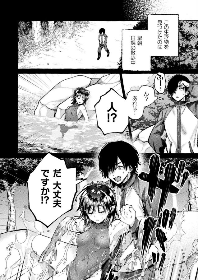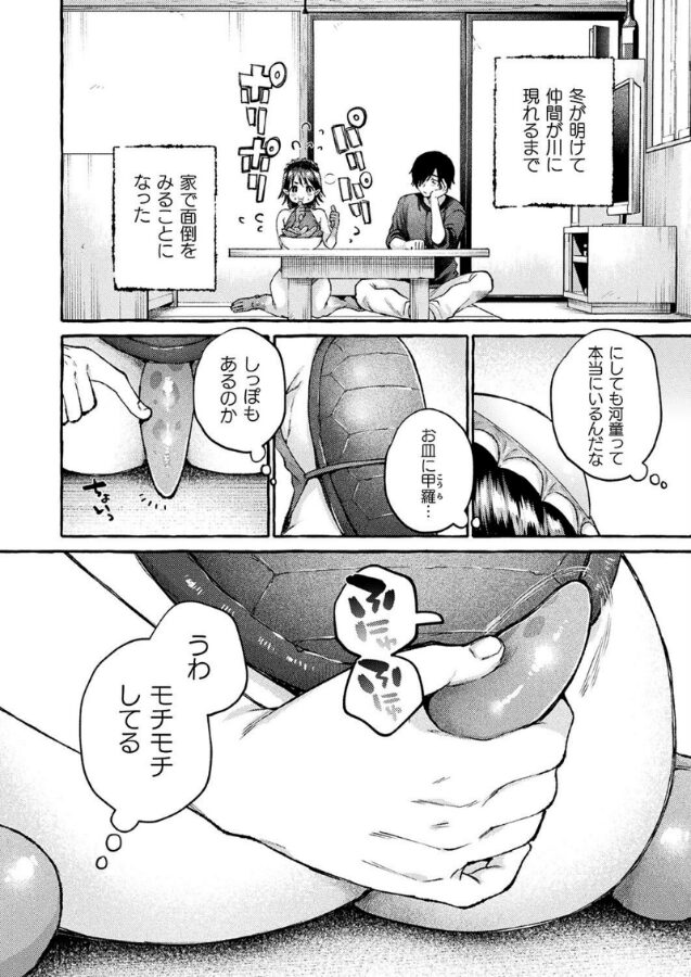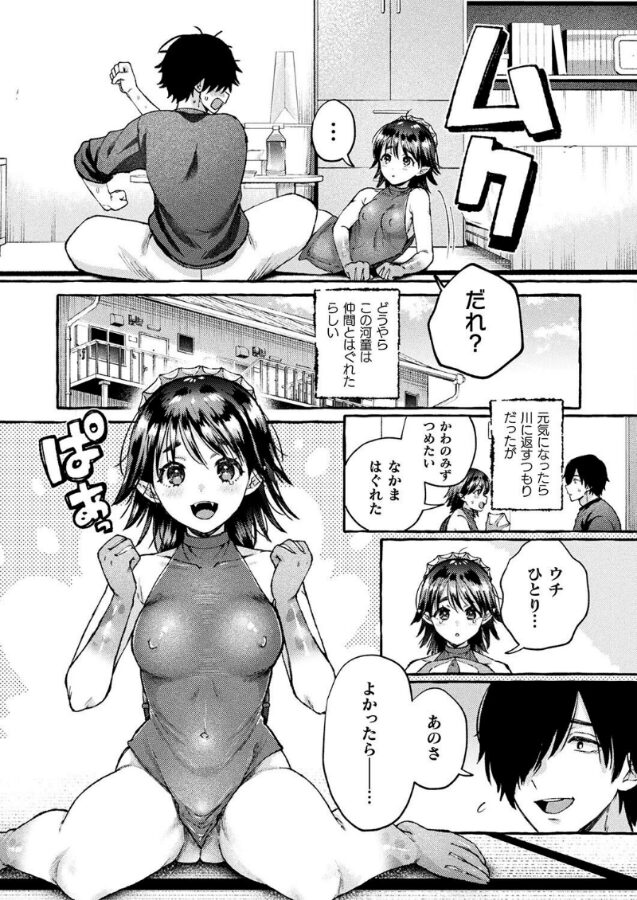 川で拾った河童ちゃんとのなりゆき無知ックス! 早朝、川沿いを散歩していた青年は行き倒れていた河童の少女を発見し、やましさを覚えつつも介抱する。そして、目を覚ました彼女から仲間とはぐれたという事の経緯を聞かされた青年は、彼女の居候を提案し同居生活が始まる。そんなある日、食事に夢中な彼女の尻尾に何気なく触れた青年は、くすぐったい反応を示した彼女の艶めかしい表情に興奮して密かに勃起してしまう。すると、河童が青年の股間に反応を示し、おいしい匂いがすると言いながら彼のズボンを強引に脱がせ、興味津々な反応でペニスを扱き始める。彼はされるがままペニスを弄られ水かき手コキであっという間に射精してしまう。さらにアナルに舌を挿入され、前立腺を犯●れながら青年は次第に快感に浸っていくが、尻子玉の言い伝えをふと思い出し、とっさに彼女と距離を取る。しかし、知らず知らず愛液をにじませ発情する河童に青年は目が離せず――。