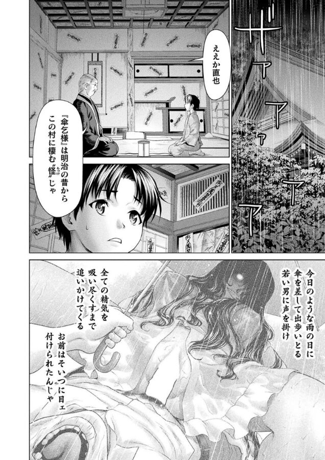 傘を求め彷徨う怪異が少年の精を奪い取りにやってくるホラーエロス! 祖父の家に遊びにやってきた少年・直也は、雨のなかで道に佇む一人の女性に声を掛けられる。すると、彼を迎えに来た祖父にその出来事を話すや否や血相を変え、直也は結界を施した部屋に隔離される。その晩、遭遇した傘乞様という怪異の話を聞かされ不安で寝付けない直也は、突如結界を破り部屋に侵入してきた少女の姿をした傘乞様に迫られる。恐怖のあまり身動きが取れない直也は、足元から上半身にかけて身体を舐め回しながら身体を這ってくる彼女に一方的に犯●れ、そして精を貪ることに執着する彼女のフェラで絶頂してしまう。束の間、彼の精を取り込み身体が大きく成長した彼女から不思議な飴玉を飲まされペニスが肥大化した直也は、立て続けに傘乞様の手コキ、素股コキと責められ、さらには騎乗位でペニスを膣内へと飲み込まれていき……。