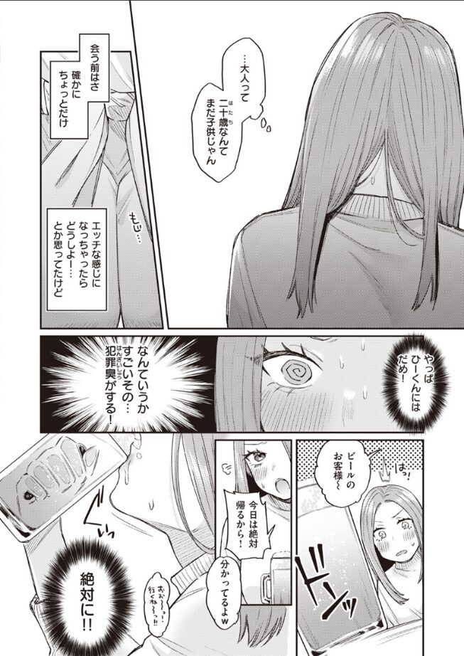 | タイトルにはショタ要素がありますが、本編は特にそのような描写は少ない気がしました。 絵は特に現実離れしてる感じもグロ要素もないので女性の方でも楽しく読むことができます。 主人公雪乃は独身で男遊びばかりをしている28歳女性です。 裏垢に自分の写真や性癖を公開するようなアカウントにマッチした男性に会うことになります。待ち合わせにに現れたのは成長した8歳年下の幼馴染ヒー君でした。 雪乃はヒー君が子供の頃に一緒に遊んであげた記憶から誘惑してくるヒー君に惑わされないように理性を保とうとします。 そのはずがお酒を飲みすぎてホテルに行ってしまいます。居酒屋での二人の駆け引きはすごくリアルだなと感じ、ワクワクしました。 ホテルのシーンではソフトなアブノーマルな描写が続きますが、終盤恋愛要素も入ってきます。 個人的には男女の駆け引きや後半の恋愛の要素からとても面白く、成人女性の私でも無理なく楽しく読むことができました。 |