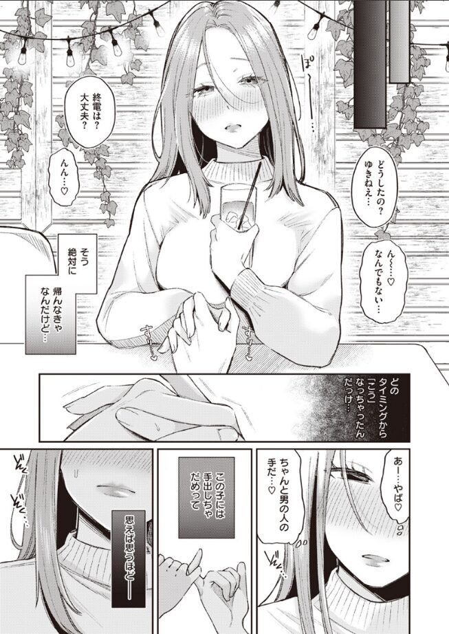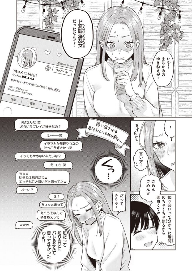 | 男遊びが趣味の独身女性「雪乃(ゆきねえ)」が主人公。 自身のSNSでド変態性癖丸出しの淫乱アカウントを運用しています。 DMでオフパコ相手を募っていたところ、偶然にも昔近所に住んでいた男の子「ひーくん」と出会います。 ひーくんの子どもの頃を思い出し、セックスするのを躊躇うゆきねえの反応が可愛らしいです。 結構な背徳感を感じさせる内容となっています。 ゆきねえは、ひーくんの幼い頃を知っているため、当初はセックスすることに抵抗感を持っているのが特徴です。 しかし、ひーくんの大人の部分を感じてからは、スイッチが入り、淫乱の本性をさらけ出していきます。 ドMのゆきねえはひーくんの責めに体を反応させ、徐々にひーくんのいいなり状態になっていくのがエロいですね。 ひーくんは、ゆきねえのことが好きだったようで、少し重めの恋心が暴走したような感じになっています。 |