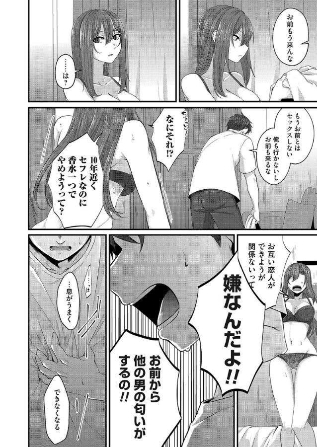 薫(かおる)と清花(きよか)は、両思いに気づかないままセフレになって10年が経つ。2人の体は相性抜群で、匂いフェチの薫は清花の匂いが大好きだった。しかし近頃、清花は最近出会った見合い相手の香水を体に纏わせて薫の前に現れる。清花の体から別の男の臭いがしてくることに許せない薫は、怒りで動転し、ずっと隠していた自分の恋心を伝えてしまう。清花は戸惑いながらも見合いを断り10年の思いを返事に乗せる。「薫がいいからここにいるのよ」薫は驚き、満たされ、2人は愛を確かめ合う。もう体からは清花の匂いしかしない… 火のついた清花のつぼみ。とめどなく蜜が溢れ出る…蜜吸う薫は蝶か、はたまた蜂か。太い陰茎が清花の膣内を舞い、挿す。薫は水をやり種を蒔く。2人の間に花が咲いていく…