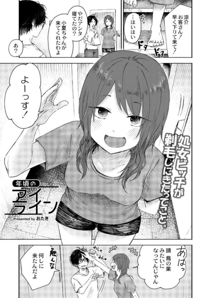 処女ビッチが剃毛しにきたってこと。夏休み。幼なじみの小夏がいきなり家に遊びに来た。友達と海に行くから水着を買ったらしいのだが…「ハミ毛一本でもあったらかっこ悪いじゃん」風呂場で幼馴染のマンコを目前にし、主人公のチンコは興奮を隠せなくなる…!「アタシのマン毛剃りながら興奮してたんだ」衝撃のデビューから早くも3作目!令和のキュンキュン製造機・おたき先生!今回も最強のキュンを届けに降臨!