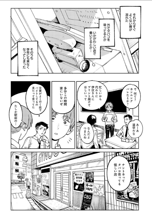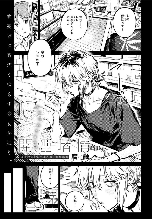 主人公・京本は、かつて仲が良かった不登校のクラスメイト・伊伏真夜にプリントを届けるよう頼まれる。彼女がバイトをしているという店を訪れると、そこには髪の毛を染めた気だるげな雰囲気の伊伏がいた。すっかり変わってしまった彼女にベ○プの新しいフレーバーを勧められた京本だったが、誤ったフレーバーを試して気分が悪くなってしまって――。気付いたら伊伏のベッドで横たわっていた!? 伊伏と2人きりの空間で、彼女が変わってしまった理由を知る京本。しかし同時に自分が伊伏に想いを寄せていたことにも気付き…。お互いの気持ちを知った初心な2人の不器用な初SEXがここに――。ストーリーで魅せる超実力派・腐蝕先生が贈る、やさぐれた両片思いJKと心通わす等身大SEX♪