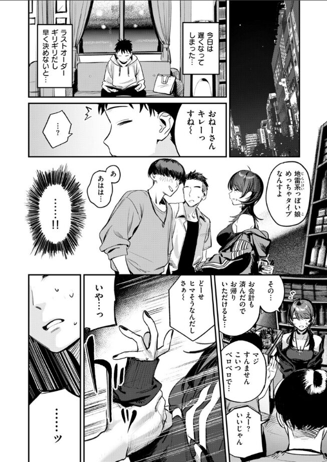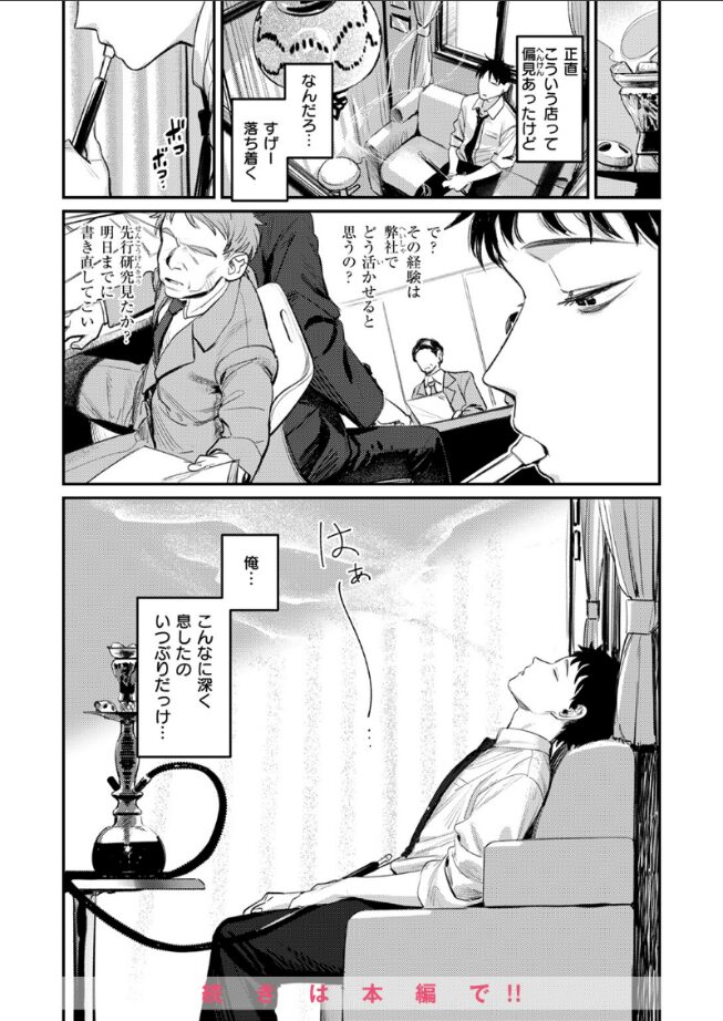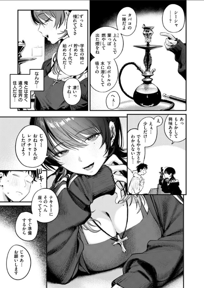 面接の帰り道、大雨の中で項垂れていると、ピアスバチバチのサブカル系お姉さん・カナに声をかけられ、彼女が経営しているというシーシャバーで雨宿りをすることに。店内に招かれ、初めてのシーシャ体験に癒された俺は、定期的に店に通うようになる。