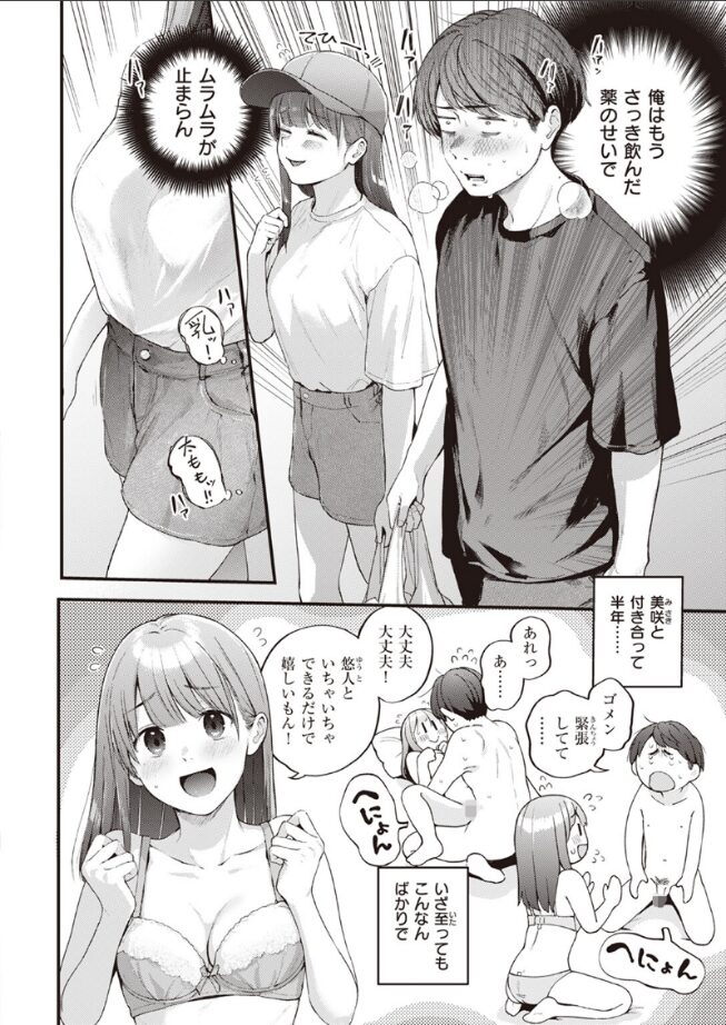 「えっと ち〇ちん……そのっ 苦しそうだったから」美咲(みさき)と付き合ったものの、緊張のせいで致せず早半年。今日こそはと、勃起不全薬とサプリメント、精力ドリンクを飲んで、準備万端!! のはずが飲みすぎたのかダウンしてしまった俺。なんだか下半身が……と起きると美咲が俺のち〇ぽを挿入していて!?バフのかかったち〇ぽで、カノジョと念願のいちゃらぶSEX!!