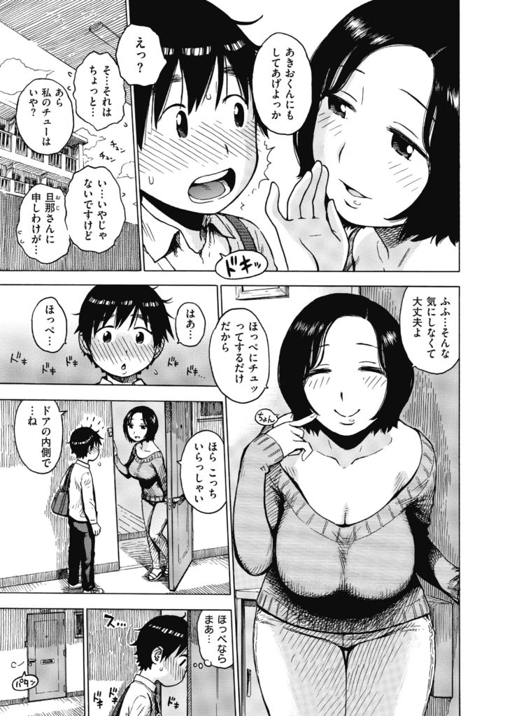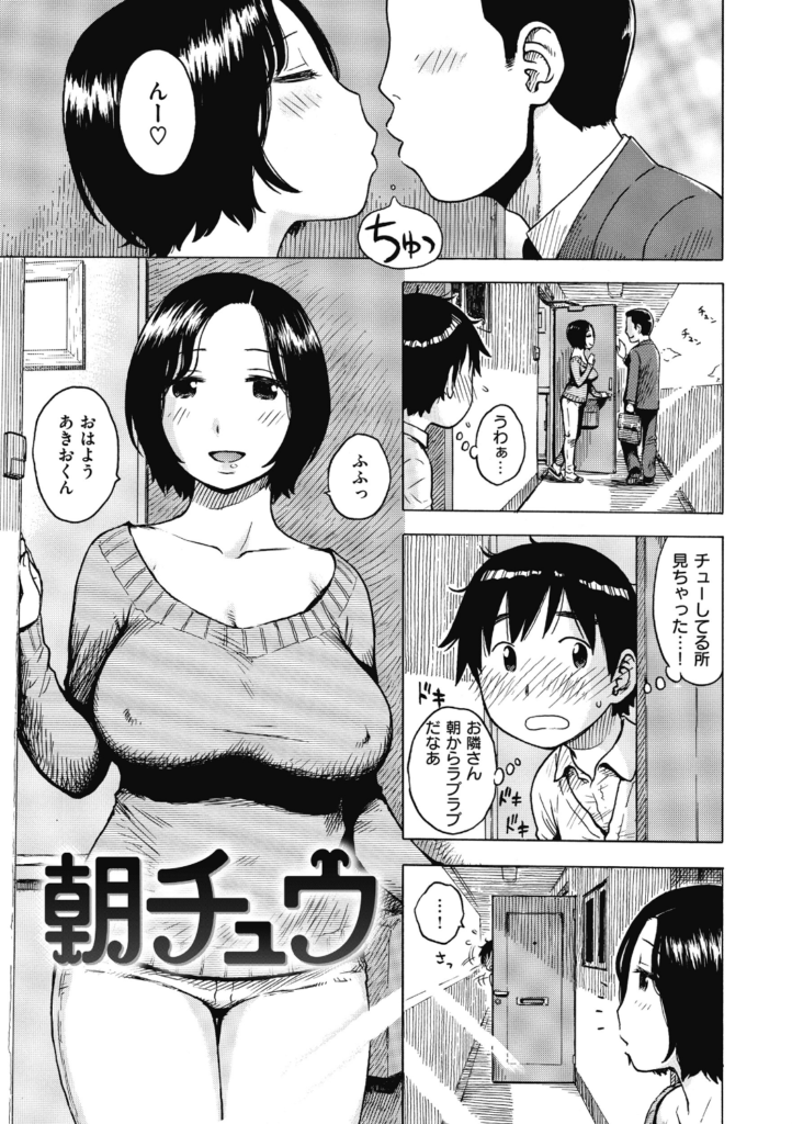 朝からラブラブな隣人夫婦が出勤前にチューをしているところを目撃してしまった男子学生。見ていたことが奥さんにバレたら、なんと自分にもキスをしてくれることに!!玄関で唇を奪われると、そのままねっとり舌を絡ませるオトナのチューが始まり……。