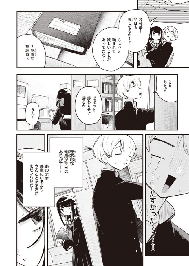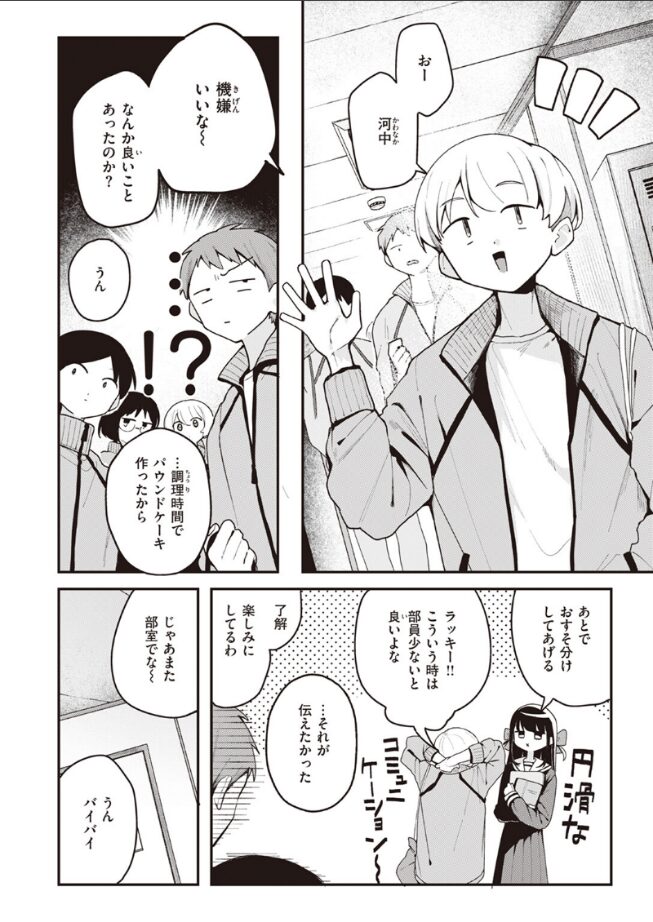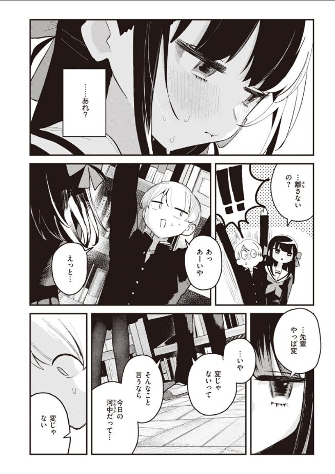 「先輩…も触ってくれる…?」無表情で何を考えているのかわかりづらい文芸部の後輩・河中(かわなか)ちゃん。彼女の感情が顔を見ただけで大体わかる先輩の朝戸(あさと)は、友人によく見てると言われたことをきっかけに、彼女のことを意識し始めてしまう。河中ちゃんのほうは、いつまで経っても気持ちに気付かない朝戸にやきもきしていたようで……。