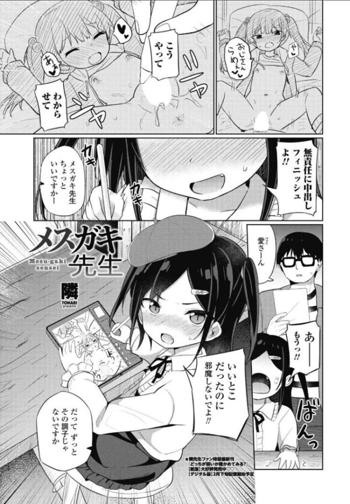 メスガキ先生(JD)は売れっ子エロ漫画家。自分のぷにろり体型を活かしてメスガキキャラになりきり愛を込めて新作執筆。漫研仲間の真田の古臭くてリアリティのない純愛漫画をバカにして、参考資料になってあげるから君もメスガキ漫画を描けば?と煽ったら…自分の作品通りのわからせセックスされてしまった!……隣「メスガキ先生」