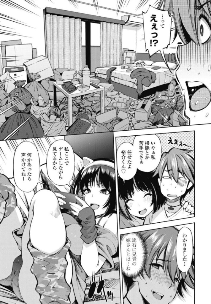 兄嫁の麻衣に呼び出され、綾乃との不倫セックスをお説教された裕介。口止めの条件としてひどい汚部屋の片付けを任されてしまった。言われた通りに働いていると、兄の海外出張を強調されたり突然下半身丸出しのオナニーを始められてしまうが…これって揶揄われてる?それとも誘われてる!?……舞原マツゲ「人妻ゲーミングレッスン Lesson3」