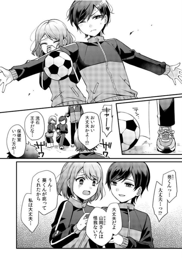 体育の授業中もいつも通りオウジサマな葵を見て、意識しているのは自分だけではないかとモヤモヤしていると、クラスの女の子めがけて飛んできたサッカーボールから身を挺して庇っている葵の姿が目に入る。