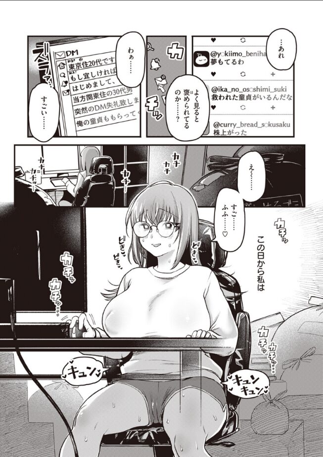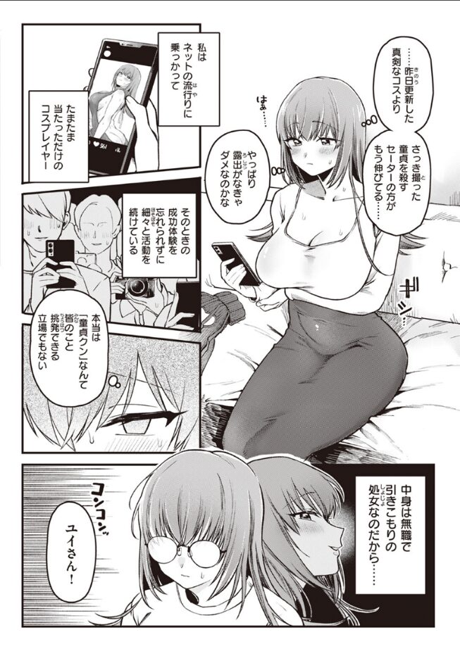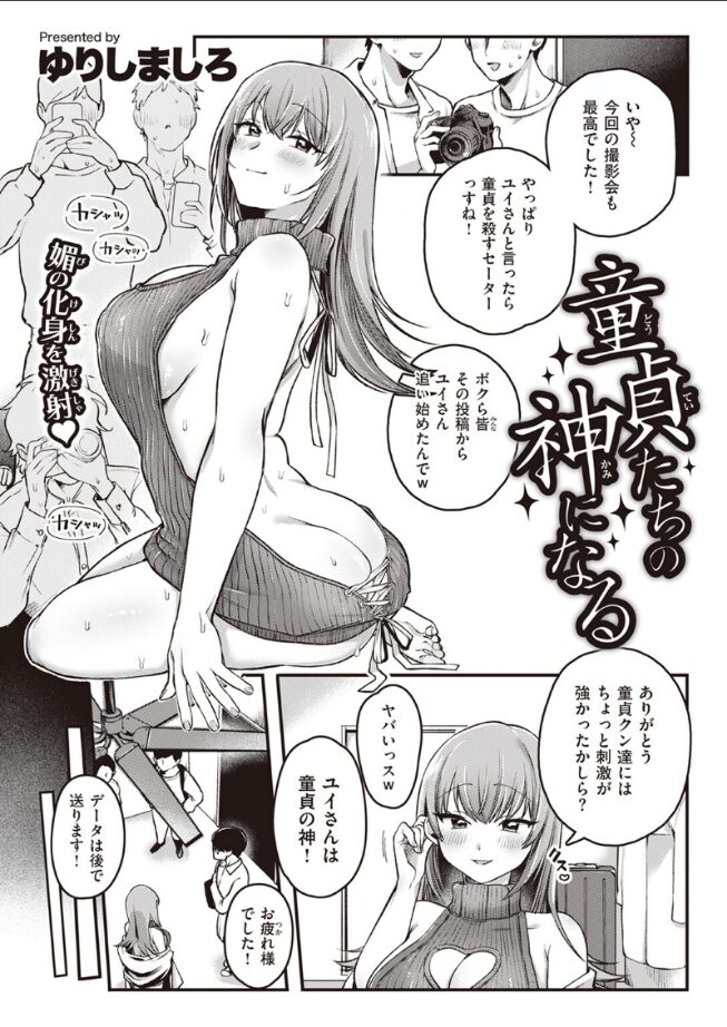 (人の役に立つのってこんなに気持ちの良いことなんだ……!!)エロコス写真がバズり人気コスプレイヤーになったユイ。自分のファンを童貞クンと煽る彼女だが、本当は無職で引きこもりの処女だった。しかしある日、ファンの一人に筆下ろしを懇願され、脱処女と共に承認欲求が満たされる快感にハマってしまう。童貞たちとのオフパコに励むようになったユイは、より多くの人々を救うため童貞限定の大規模オフパコ会を決行。 迷える童貞たちの精液を一身に浴びる女神となった!!