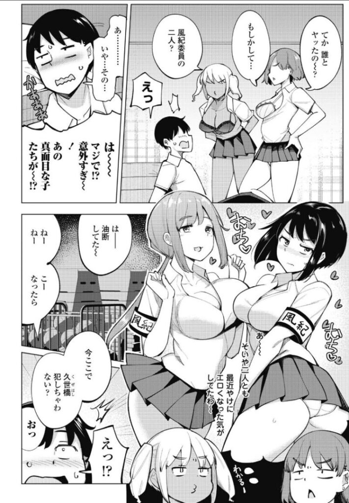 一本杭「後輩甘やかしハーレムin風紀委員会 第8話」風紀委員がエッチに夢中になっている間に、校内はエロい格好の女子で溢れかえっていた!慌てて服装指導を再開する久世橋だが全く相手にしてもらえない。そのうえ久世橋の脱童貞を知った『いつもの2人』に体育倉庫に連れ込まれてしまい…!?