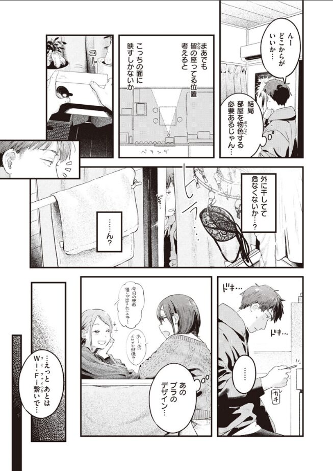 サークル活動の一環として、女子の部屋に上がり込み映画鑑賞というどきどきイベントの日。道中、天空からふわり舞い降りてきたエロ下着(パンツ)を懐に忍ばせていたものの、ふとベランダの物干しを見ると同じデザインの(ブラ)が……!?まさかと思い軽くかまをかけると、そのまさかだった!!