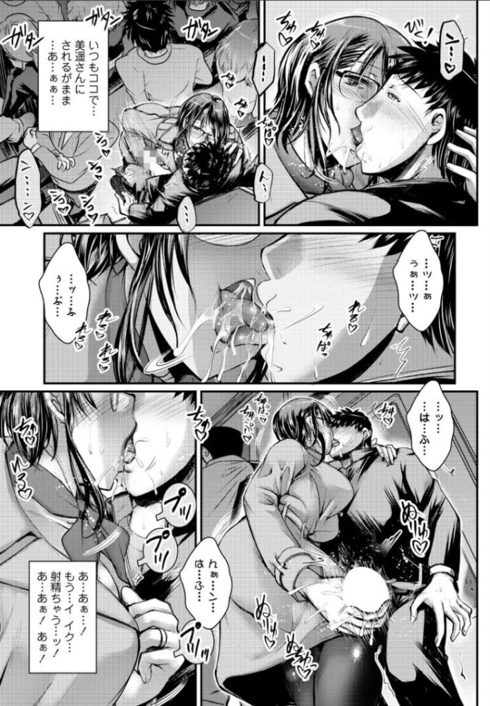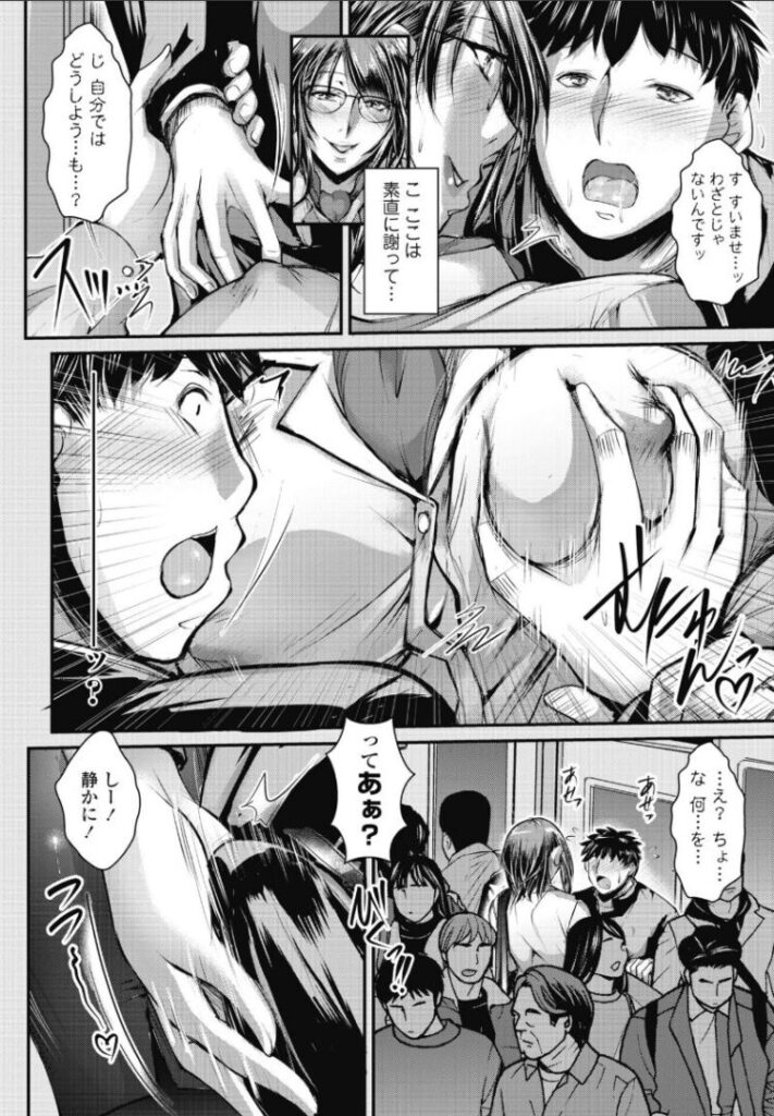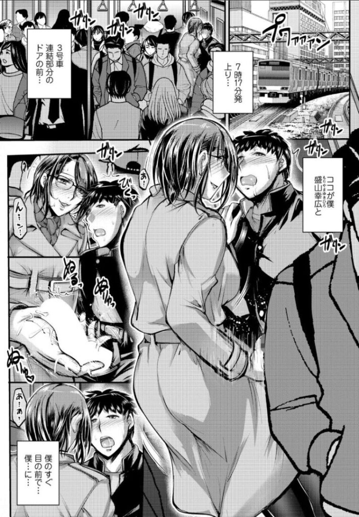 タケイツカサ「マン淫電車でハメられて」2週間前から始まった通学時の習慣。満員の電車の中でOLの美遥さんと待ち合わせ、彼女に痴●をされること…。今日もいつもの車両で勃起を扱かれていたのだが、射精直前で手を止めた彼女はコートの下に何も身につけておらず…。