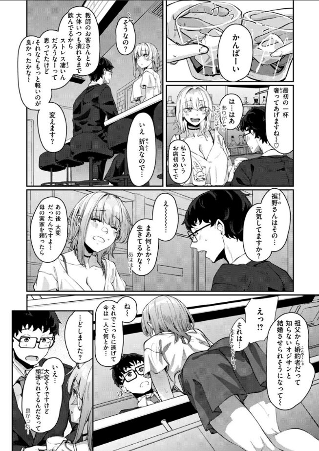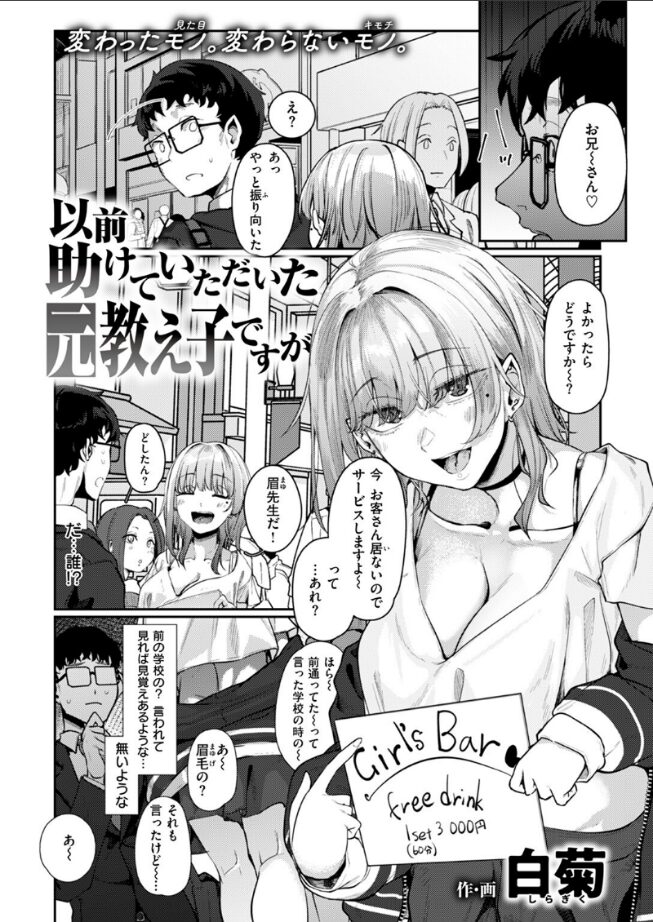 「教師の癖に教え子に こんなに欲情しちゃってるんですか?」夜の街で声をかけてきたのは、元教え子のしずく。かつての地味な眼鏡の少女はどこへやら、すっかり派手になったしずくにガールズバーに連れて行かれる教師。しずくの変化に戸惑ううちに、教師の意識はお酒に飲まれ……昔の姿に戻ったしずくが、淫靡な顔で教師の肉棒を咥えてみせる。激しい口淫に精が込み上げていく中、教師が夢から目を醒ますと――