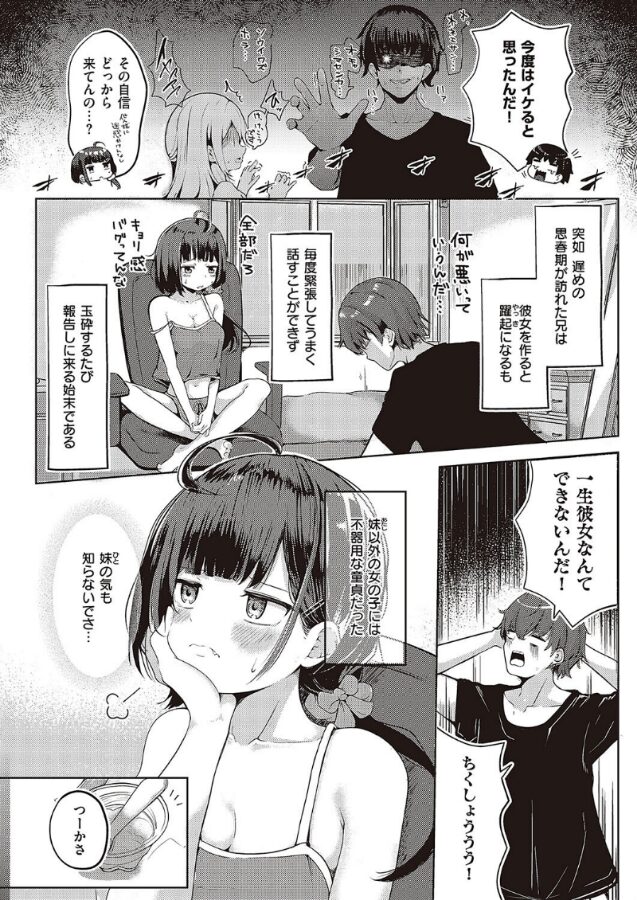 密かに好意を寄せている兄から、ナンパ失敗の報告を受ける一途で巨乳な妹・文乃。童貞卒業したいと言う兄のために、文乃自ら「彼女」に立候補!!成長したカラダを押し付けて、兄に誘惑すると満更でもない様子で…!?エモかわルーキー・えりゅ先生が贈る、お兄ちゃん大好きなブラコン妹がカラダを捧げる大胆アプローチ♪