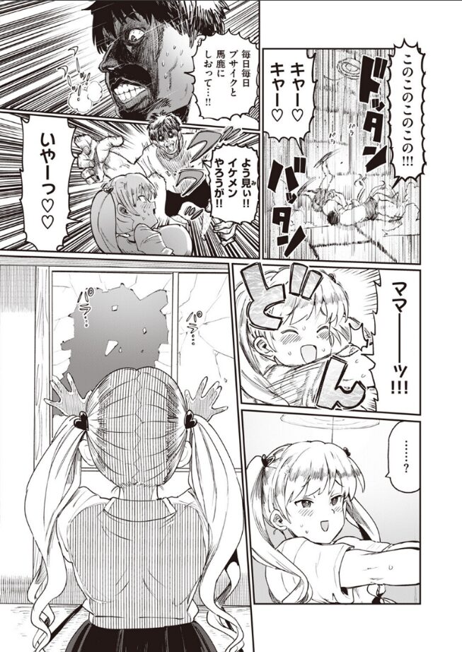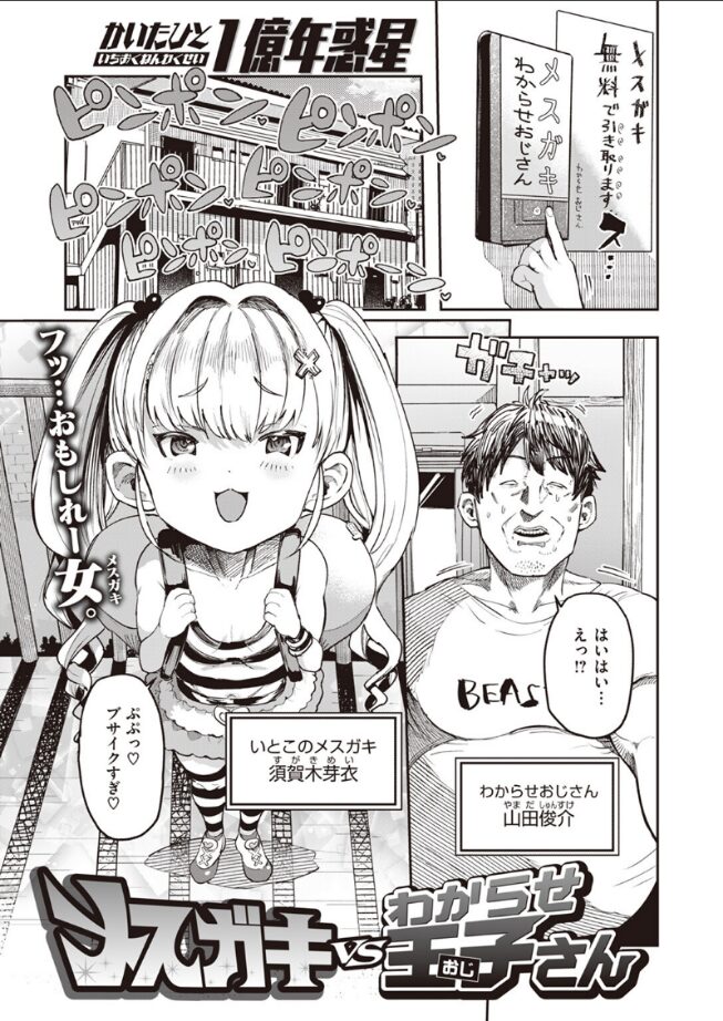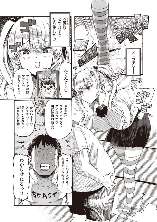 | 独特だなと感じる漫画でした。タイトルからして非常に独特ですよね。 作者さんのネームまで独特でした。途中まではギャグ漫画、それからはプロレス+エロ漫画みたいな感じでした。エロ漫画を読んで興奮するという要素が極めて少ないのも特徴的です。 自分は正直、プロレスとか格闘技とかの影響を強く受けた作者さんの作品なのかなあと思い読みました。新たなジャンル、そしてJKになったメスガキの想定身長も180センチですからね。 おじさんの方もかなり立派な体格であり、セックスの方もエロイというよりなんかの技のような感じでした。そもそも放り投げるシーンが滅茶苦茶多いです。最終的にはエロ漫画を読んだというより、エロ要素もあったお笑い漫画を読んだ気分です。 |