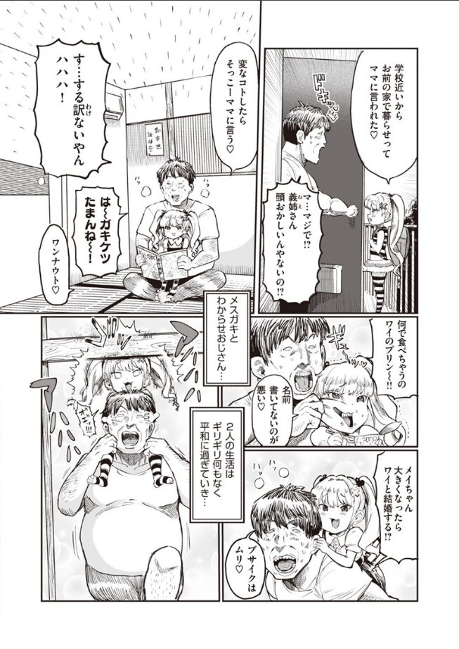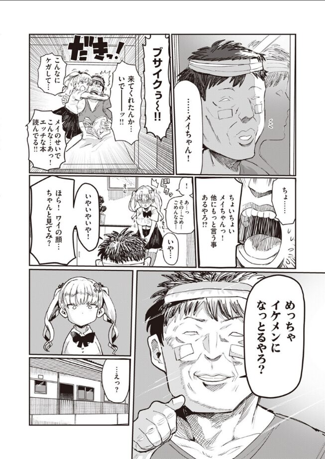 | ギャグ要素が強いラブコメHが楽しめる作品。 主人公は、メスガキわからせおじさんである「山田 俊介(やまだ しゅんすけ)」です。 いとこのメスガキ「須賀木 芽衣(すがき めい)」と共同生活を送ることに。 月日が経ち、ムチムチのメスガキに育った芽衣にブサイクだと馬鹿にされ、キレて襲い掛かるおじさん。しかし、芽衣の反撃に合い重傷を負うことに。 一命はとりとめましたが、なぜか自分をイケメンだと思い込む後遺症が残ります。 自分をイケメンだと錯覚したおじさんは、芽衣に迫っていくのでした。 Hの内容はかなりのイチャラブで、Hの最中に、芽衣の目の中にハートマークが見えるのが印象的です。 甘々Hですが、わからせおじさんである俊介は、かなり激し目に芽衣を責めます。激しく腰を打ち付けられても感じる芽衣が、すごくエロ可愛いです。 笑える物語ですが、しっかりとエロも感じられる内容となっています。 |