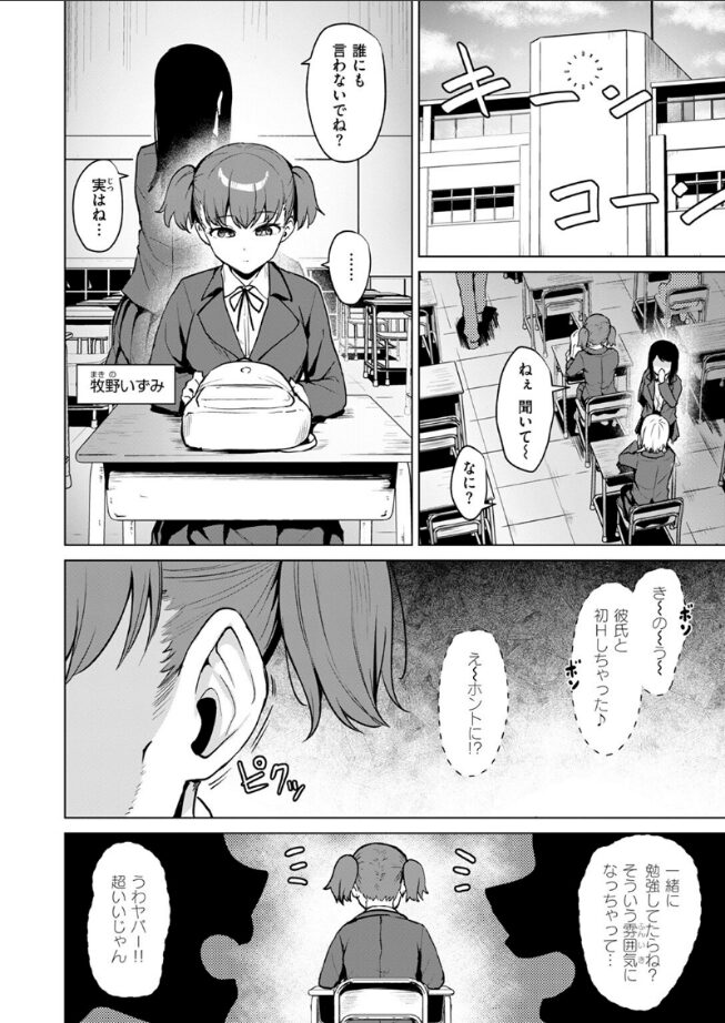 (アタシは今 人生で初めて 他人のセックスを見ている)牧野(まきの)いずみは、学校で同級生の《彼氏とのH》のひそひそ話しを盗み聞きしては、羨ましく思う日々を過ごしていた。ある日、《セックス見学》というキーワードをネットで調べていたいずみは、勢いで募集者に連絡をしてしまう。そして、待ち合わせ場所に現れたのは、意外にも普通の大学生のような潤(じゅん)とそのセフレの志穂(しほ)。安心したのも束の間、ホテルに到着したら2人は慣れた様子で服を脱ぎ始め、いずみの目の前で当然のごとくフェラをし始める――――。心の準備もままならないまま、いずみは本物のSEXを見せつけられて……!?