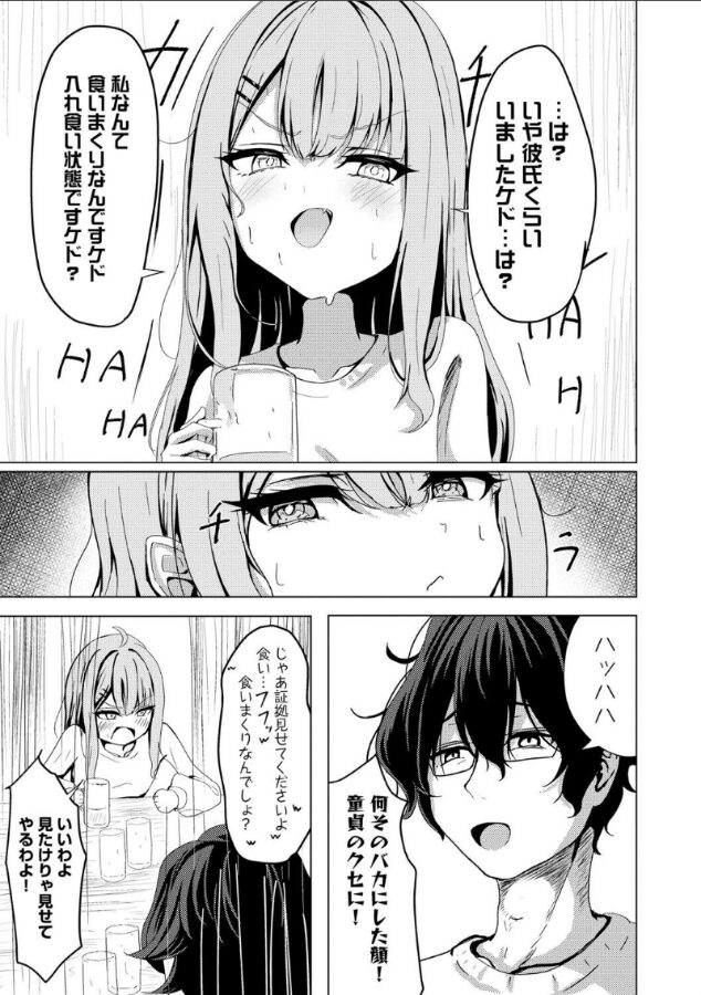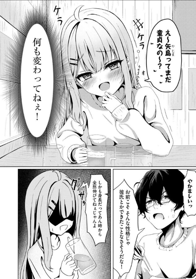 | 同級生との再会からお酒によってエッチな展開へと進んでいくという、現実でもあり得そうなシチュエーションだからこそ味わえる興奮がこの作品にはあります。 主人公の同級生である双葉はとても生意気で、主人公のことをずっと煽ってくるのですが、その言葉の裏には好意が紛れているように思わせたりして、読んでてドキドキしました。 主人公も双葉も恋愛には不器用なのが伝わってきて、そんな二人が少しずつ可愛らしく見えてきます。前編では双葉の生意気さを描いているからこそ、後半からの攻められている双葉の女の子らしさ、恥ずかしがっている様子が余計に可愛く見えて最高でした。 |