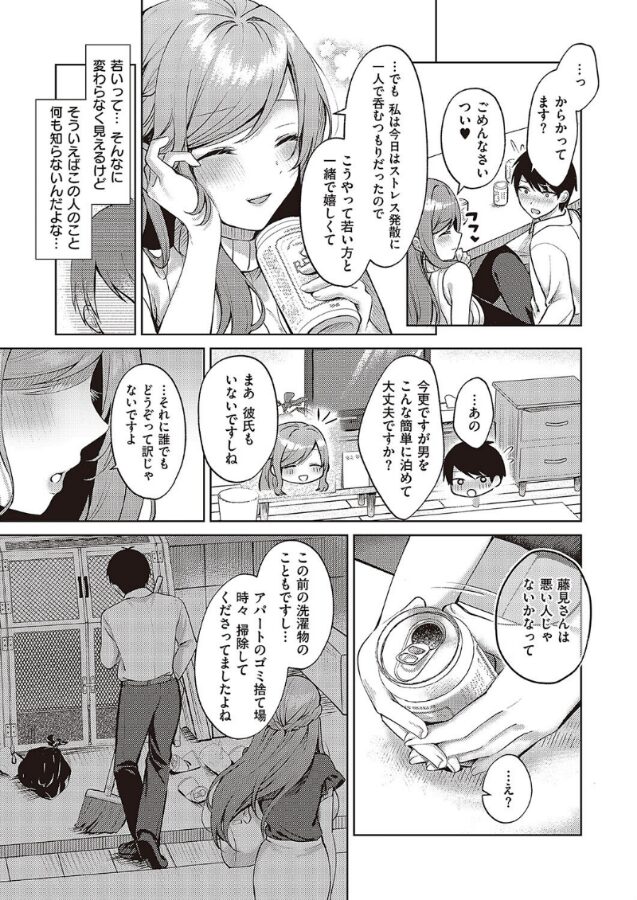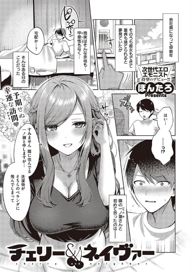 | 童貞であるサラリーマンの主人公とその隣人である巨乳美女一ノ瀬さんの関係が描かれていたのですが、とにかくヒロインの一ノ瀬さんが魅力的すぎますね。 こんな人が隣の部屋に住んでいたら気になって仕方がないと思います。それくらい女性としての色気を携えているのですぐに好きになってしまいました。会社に家の鍵を忘れてしまい部屋に入れない主人公の姿を見て一ノ瀬さんが自宅に招いてくれる展開なんかもあって俄然彼女のことが気になってしまいましたね。 部屋に男女がいてエッチな雰囲気にならない方がおかしいと思っていたら、案の定エロ展開がスタートするのでかなり興奮できました。 会社に対する不満を酒の力を借りてぶちまけていたら、一ノ瀬さんの母性が刺激されて生乳を触らせてくれる展開が起きるので本当にエロくて興奮を抑えられませんでした。 主人公は童貞なので生のおっぱいの感触に完全に絆されている姿が印象的でしたね。 この作品はキャラクター達の表情がとても豊かなので、すごく内面の部分が伝わってきますし、主人公のムラムラした気持ちに凄く感情移入できたので俄然2人の絡みから目が離せません。 |