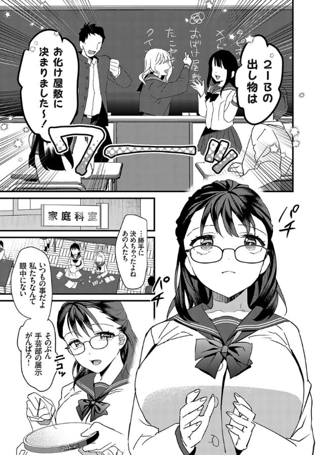 文化祭系暗闇ドキドキ輪●お化け屋敷性春白書でスガラがグレープ10周年を歓喜のザーメンシャワーで大祝福!!主人公は手芸部に所属しているクラスでは目立たない巨乳メガネJKの香田(こうだ)。文化祭が近づきクラスで出し物決めが行われ主人公のクラスはお化け屋敷をやる事に。そしてお化け役はクラスで一番かっこいい男子生徒・吉田晴太(よしだ せいた)に決まる。すると晴太の事が大好きな陽キャ女子生徒の瀬野(せの)ありさが晴太の衣装は自分が作ると言って周りに大好きアピールをしまくるのだった。その日の放課後、主人公が忘れ物を取りに教室に戻るとお化けの衣装を作っているありさに遭遇する。するとありさは手芸部という理由で衣装作りを主人公に丸投げしようとしてきたが、地味だけど実は気の強い主人公は自分で最後までやるように言い返す。しかし、それがありさの逆鱗に触れてしまい…。翌日からクラスの女子による主人公への嫌がらせが始まったのだった。文化祭当日、スク水に着替えさせられサンドイッチマンとして校内を歩き回らされ周りから奇異の目で見られる屈辱を味わう主人公。ようやく教室に戻ると次はお化け役をするように言われ透け透けのお化け衣装に着替えさせられ持ち場にスタンバイさせられる。暗がりの中、客の声がするので仕方なく脅かそうとすると逆にその客が襲ってきて……。お化けより恐いのはスクールカースト上位の陽キャJKだってばさ!