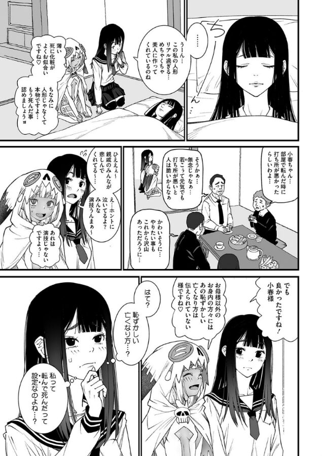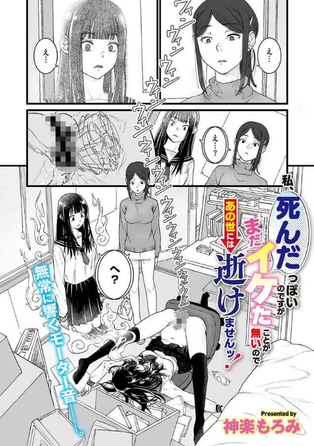 おもちゃを使って初めてイケそうな瞬間、親が部屋にやってきてしまい慌てた時のはずみで、この世を去る事になってしまった小春。霊体になり自身の葬式を呆然と眺めていると、死神見習いの死音が迎えにやってきた。まだセックスだってしたことないのにこのまま成仏なんてできやしない!!彼女は欲望のまま、霊体でヤリ残したことをすることになり……?