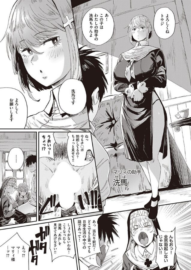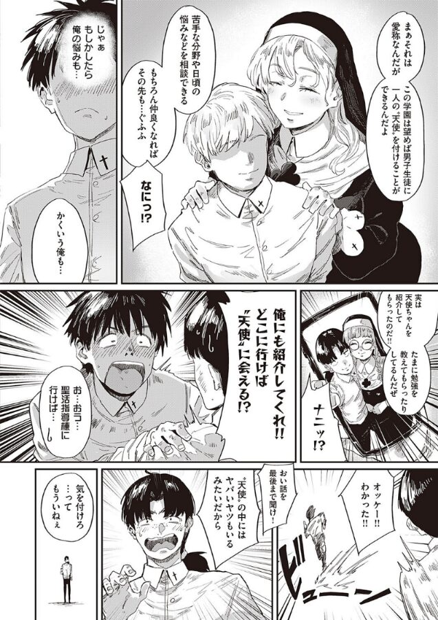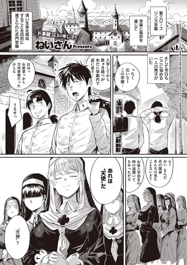 学園生活をサポートしてくれるシスター、通称’天使’。入学したての俺にはある’悩み’があり、早速天使の元を訪れる――!優しく慈愛に満ちた天使と対面…かと思いきや、目の前に現れたのはザーメン大好き性天使・金多マリィだった!早速悩みを相談する俺に、マリィはドM天使・洗場(せば)も交えて、お口でお胸で、そしておま○こで…お悩み解決してきて――!?ド本能SEXの申し子・ねいさん先生描く、チ○コがどこでも勃起してしまう主人公のために、淫乱シスター2人とお悩み解決H♪