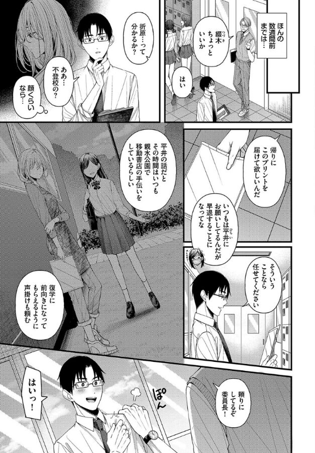 | 真面目な性格の綴木と、繊細な性格で不登校になってしまっている栞の関係性の変化に注目したくなるストーリーで、絵柄もとても綺麗だと思いました。 前半はとても濃密な人間ドラマであり、二人がどんな人物なのかというのが読者に伝わるような描写が多くあります。それによって、二人に感情移入して物語の世界に入り込むことができます。 そして中盤からは、二人の関係も深まってボルテージも上がっていき、アダルトな描写が増えていきます。 透明感と清楚感に溢れた栞がエッチなことをするというギャップに、男なら興奮を抑えられないこと間違いなしです。ですがただエロいだけでなく、あくまでも二人の関係をしっかり丁寧に描いているのが素晴らしい作品です。 |
