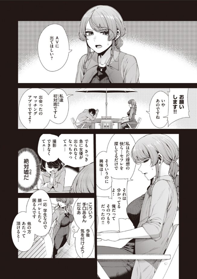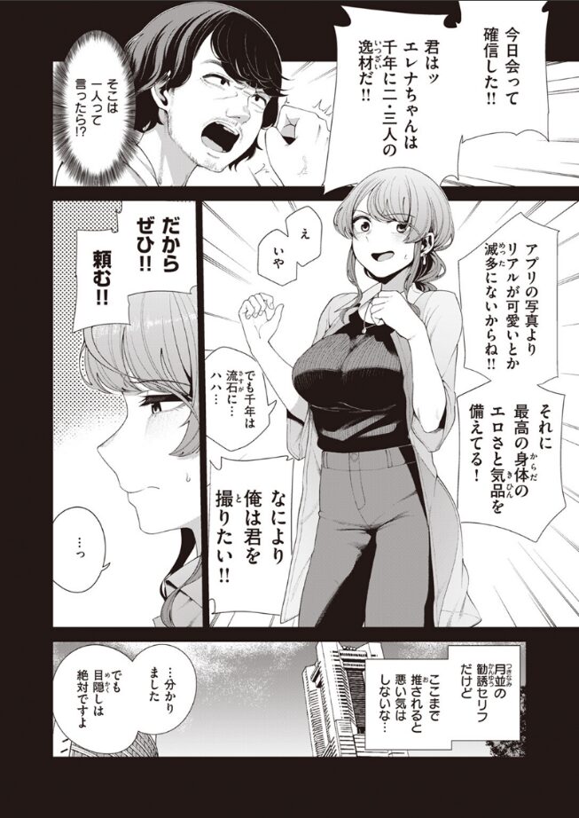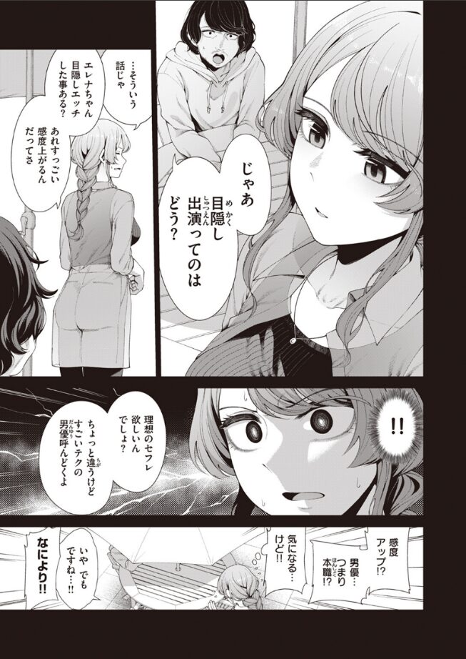 マッチングアプリでセフレを探す目的で会った男性から、予定していた女優が出られなくなったからと急遽AV出演を打診され、こういう手口の勧誘かと顔バレを理由に断ろうとするものの、目隠しプレイを提案され、感度が上がるというワードに興味を止められなくなったエレナが、あっさり承諾してしまうところにワクワクしました。