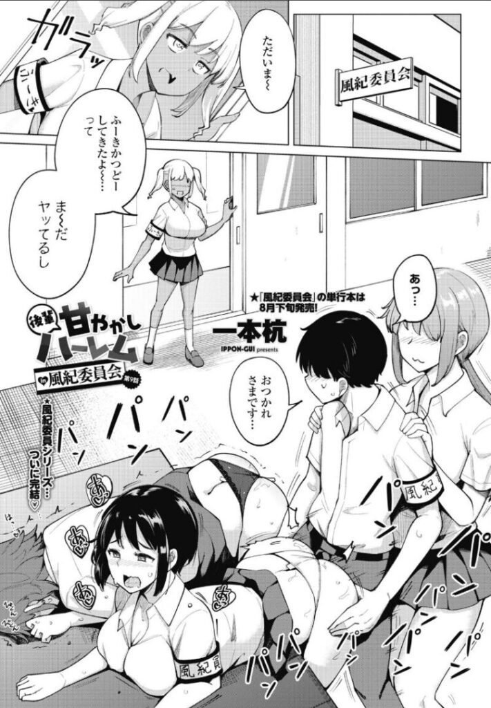 ギャルが加わった風紀委員。見回りは楽になったけどち○ぽの休まる暇はない!淫乱な女子委員たちを満足させて部室棟へ見回りに行けばそこでもち○ぽに飢えた先輩に襲われて…しかもそれは『あの』水泳部の上野先輩!?……一本杭「後輩甘やかしハーレムin風紀委員会 第9話」