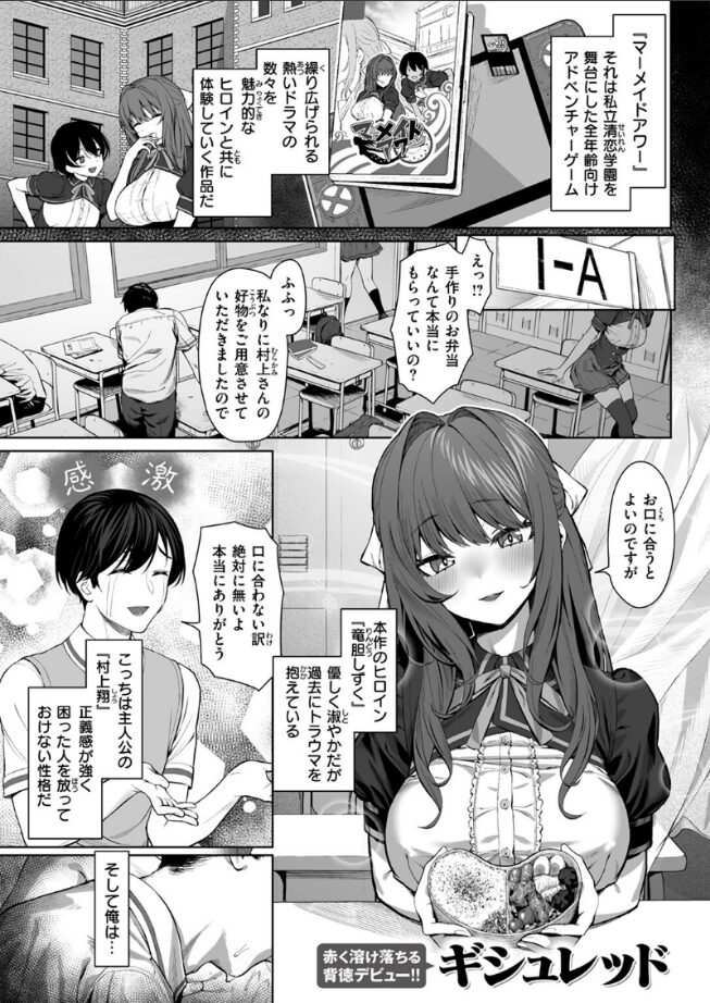 | 突然自我に目覚めたモブNPCがメインヒロインを寝取る作品。 全年齢向けアドベンチャーゲーム内で、突然自我に目覚めた「クラスメイトB」が主人公です。 主人公は、他のキャラに自我が無いことをいいことに、好き放題にヤリまくります。 とくに、主人公が気に入っているのが、メインヒロインである美少女の「竜胆 しずく」です。 おっとした性格ながら芯が強く、巨乳でスタイル抜群のエロい体をしています。 教室内やプールサイドなど、さまざまな場所、シチュエーションでヤリまくりなのがイイですね。 しずくもエロいのですが、周囲のモブキャラもエロくて素晴らしいと感じました。 しずくの友人や母親など、しずく以外のキャラクターのエロも見どころです。 自我に目覚めたしずくが、ゲーム内で想い人となる男性キャラの目の前で快楽堕ちするのが最高です! |