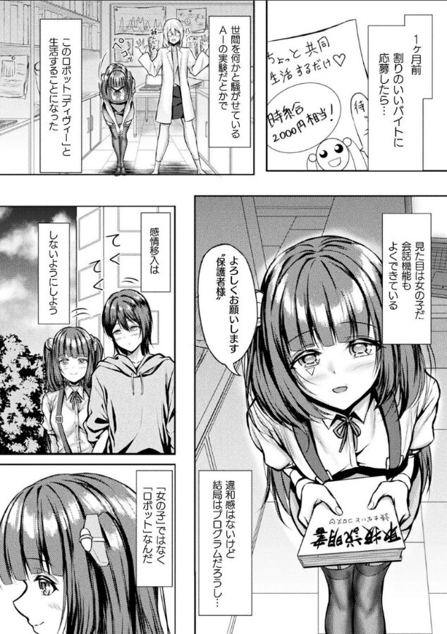 アンドロイドと一緒に生活して人間性を学ばせるという高額バイトに応募した男子学生。紹介されたディヴィーと名付けられた少女型ロボットから「保護者様」と呼ばれながら、一緒に散歩をしたり料理をしたりと何気ない日常を過ごす青年は、好奇心旺盛で日々学習していくディヴィーの愛らしい笑顔に惹かれつつも、機械相手に感情移入しないように気をつけていた。ある日、珍しく虚ろな目をしていたディヴィーに声をかけた青年は、正体不明のデータにより「キス」プログラムがインストールされたディヴィーから情熱的なキスを迫られる。自らの異変に戸惑いつつも続きを望む美少女アンドロイドは、「手コキ」「騎乗位」とインストールされていくスキルを使い人間を気持ちのよい射精へと導いていく……。※『別冊コミックアンリアル AIにわからせられる人類編 デジタル版Vol.2』収録作品