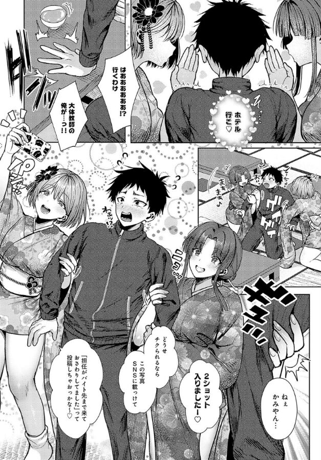 | 何度注意しても改めようとしない生徒2人に手を焼いているかみやんが、癒やしを求めて彼女たちとは正反対の清楚系美女のいる和風コンカフェに行ったところ、まさかの問題児2人が出迎えし、場が固まるところが面白かったです。 教師としてガミガミ注意するかみやんに対し、サクッと3人一緒の写真を撮ってSNSに投稿すると脅し、取引を持ちかけるところはさすがギャルといった感じで、学校にバレたら自分の方がクビになってしまうという懸念から、バイト後の彼女たちとホテルに行ってしまうかみやんの選択も、妙にリアルだと思いました。 露出度の高いコンカフェの衣装のまま現れた生徒2人に挟まれたかみやんが、教師としての理性から絶対手を出さないと心に決めるも、ギャル2人も処分を回避するために必死で、胸をあらわにした彼女たちに挟まれ挿入を求められたところで、理性が一気にぶっ飛んでしまうところも面白かったです。 かみやんとギャル2人の関係性も、舐められた教師とフレンドリーな生徒といった感じで、親近感があるからこその展開が最高でした。 |