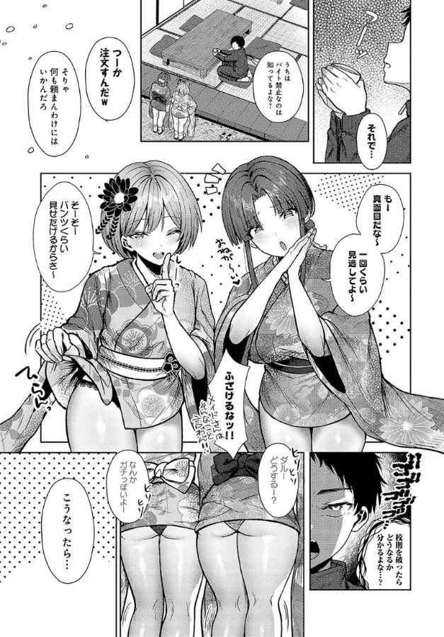 | 教え子とのハーレム3Pセックスが楽しめる作品。 担任である主人公は、「霜月(しもつき)」と「深山(みやま)」という二人の問題児に悩まされています。 日頃のストレスを癒すため、和風コンカフェを訪れると、霜月と深山がバイトをしている場面に遭遇。 二人に流されるままホテルに行き、3Pする展開に! ミニスカの和服でコスプレHするのが興奮します。 陽キャのギャルが積極的に担任に迫るシチュエーションが良いですね。 理性が崩壊した主人公が、教え子にエロエロな指導をするのが堪りません。 ストレスの元凶であった二人の教え子と担任教師が、卑猥な関係になってしまうストーリーが良かったです。 |
