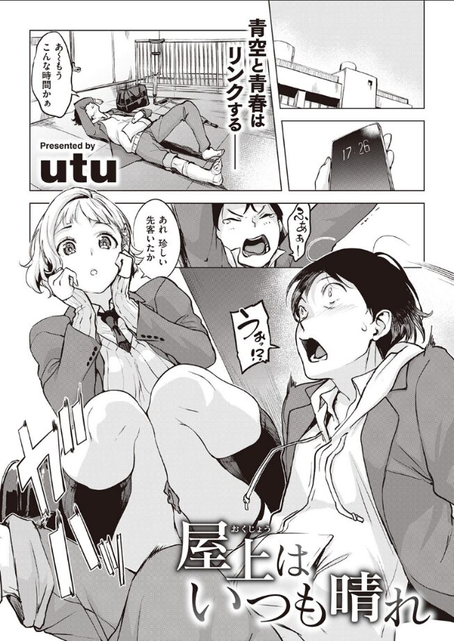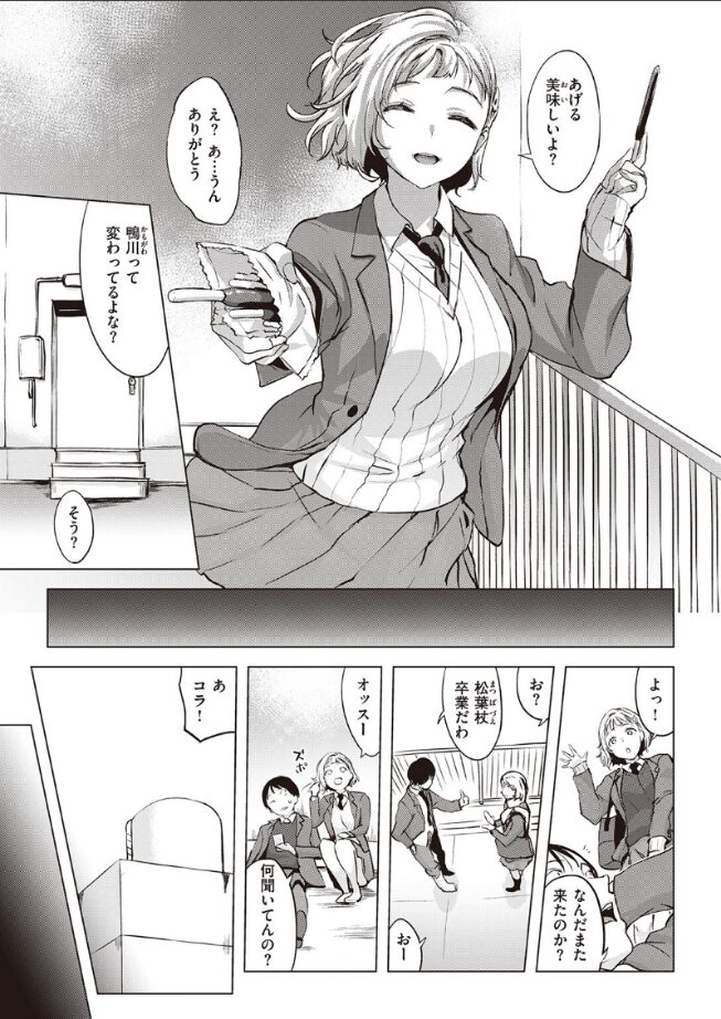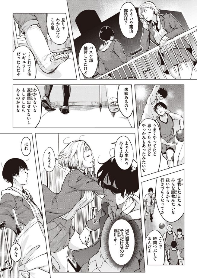 「そろそろあんな奴 さっさと忘れたい! 手伝ってくれる? 葉山?」 怪我で部活に出れないバスケ部員の葉山(はやま)は屋上で時間を持て余していたところ、隣のクラスの少し変わった女のコ・鴨川とよく会うようになった。 ある日、屋上には情事にふける男女の先客がいて……それは鴨川の元カレだった。 自分が屋上に来るようになった理由を話し始める鴨川。元カレを忘れたい、彼女の願いを聞いて……。